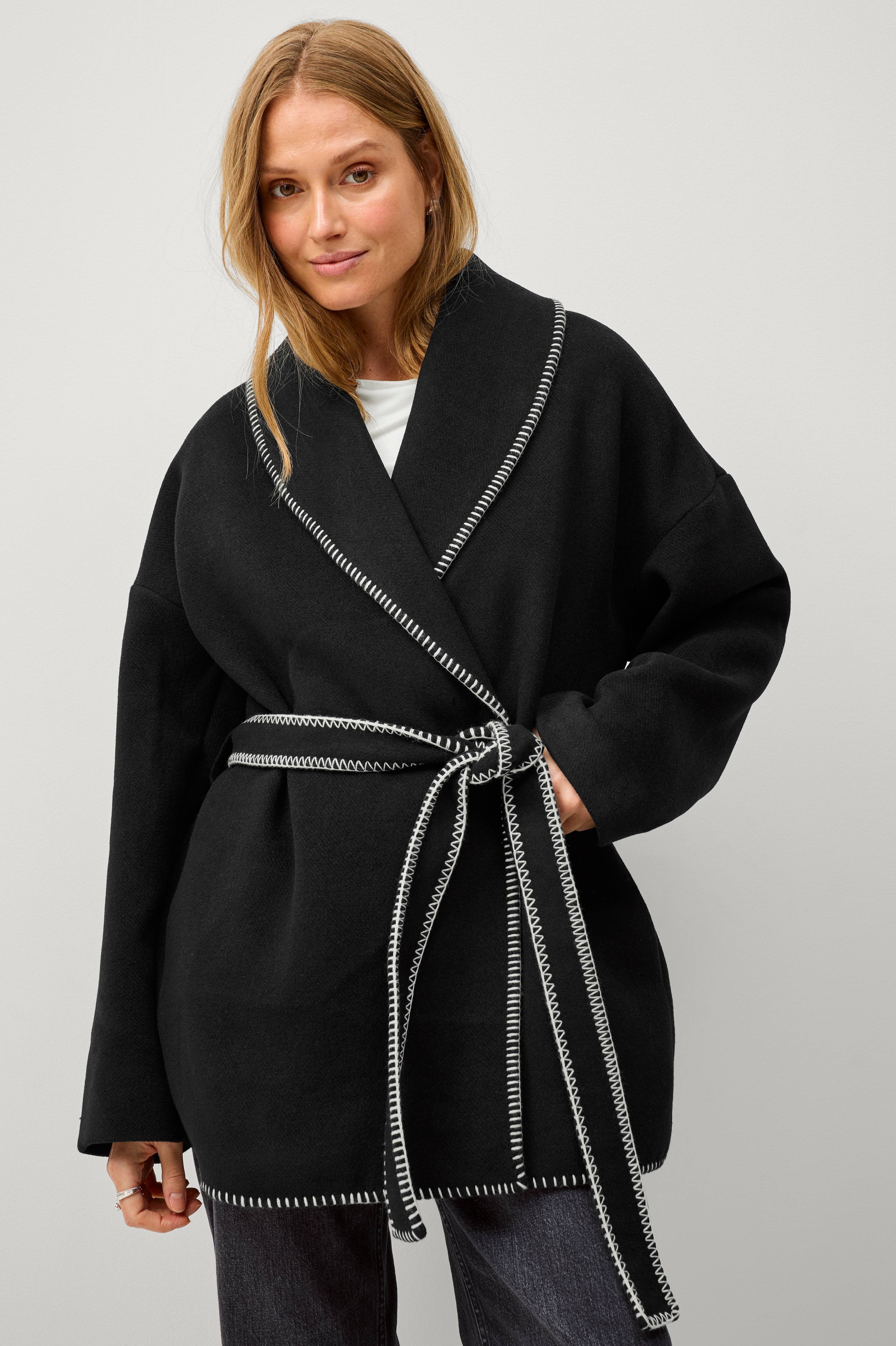 • Kort frakke i uldblanding• Filtet kvalitet• Kontrastfarvede dekorative sømme• Lukning med skjult trykknap• Aftageligt bindebælte ved taljen• Vævet, glat for• Længde: 72 cm i størrelse S