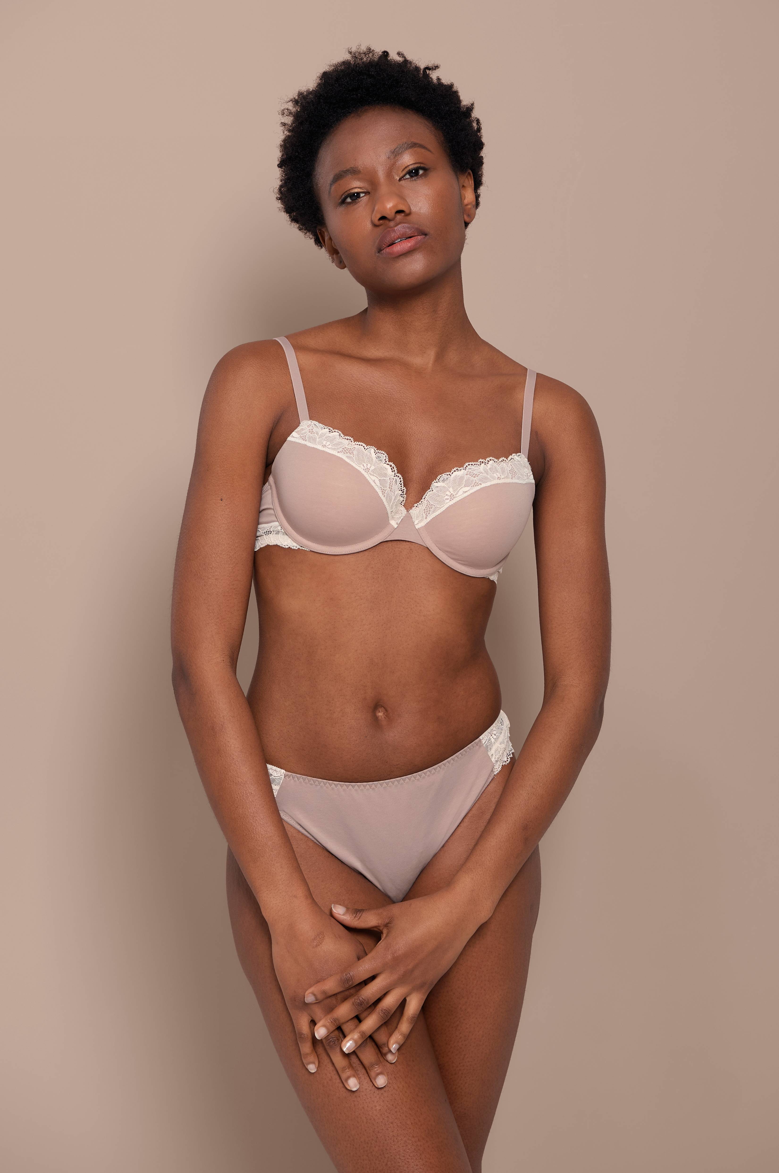 G-streng i jersey af økologisk bomuld med kontrastfarvet blonde i siderne. Foret skridt.