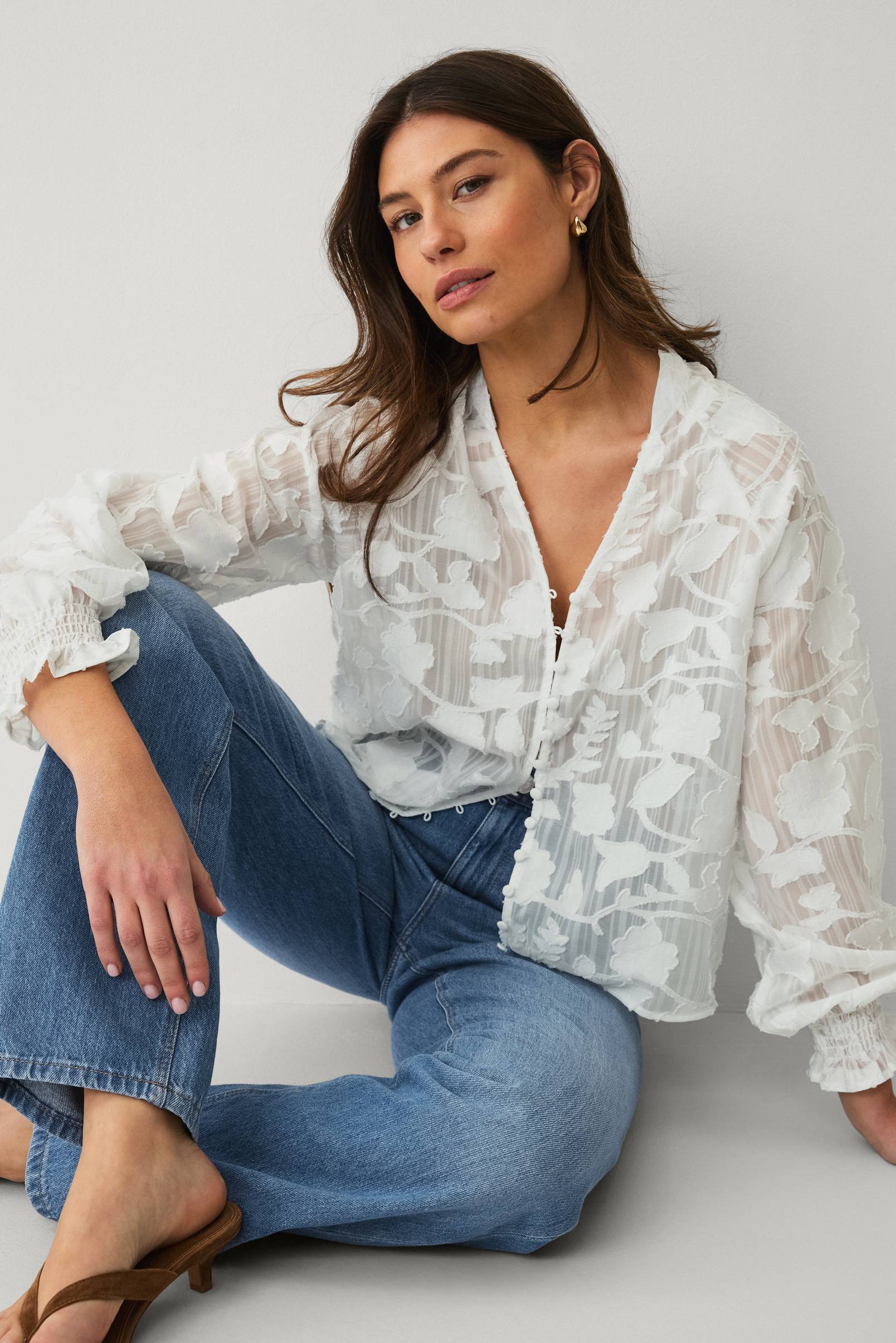 • Semitransparent bluse med jacquardvævede detaljer• V-udskæring• Lange raglanærmer• Volant ved manchetterne• Knaplukning• Normal pasform• Længde: 57 cm i størrelse S