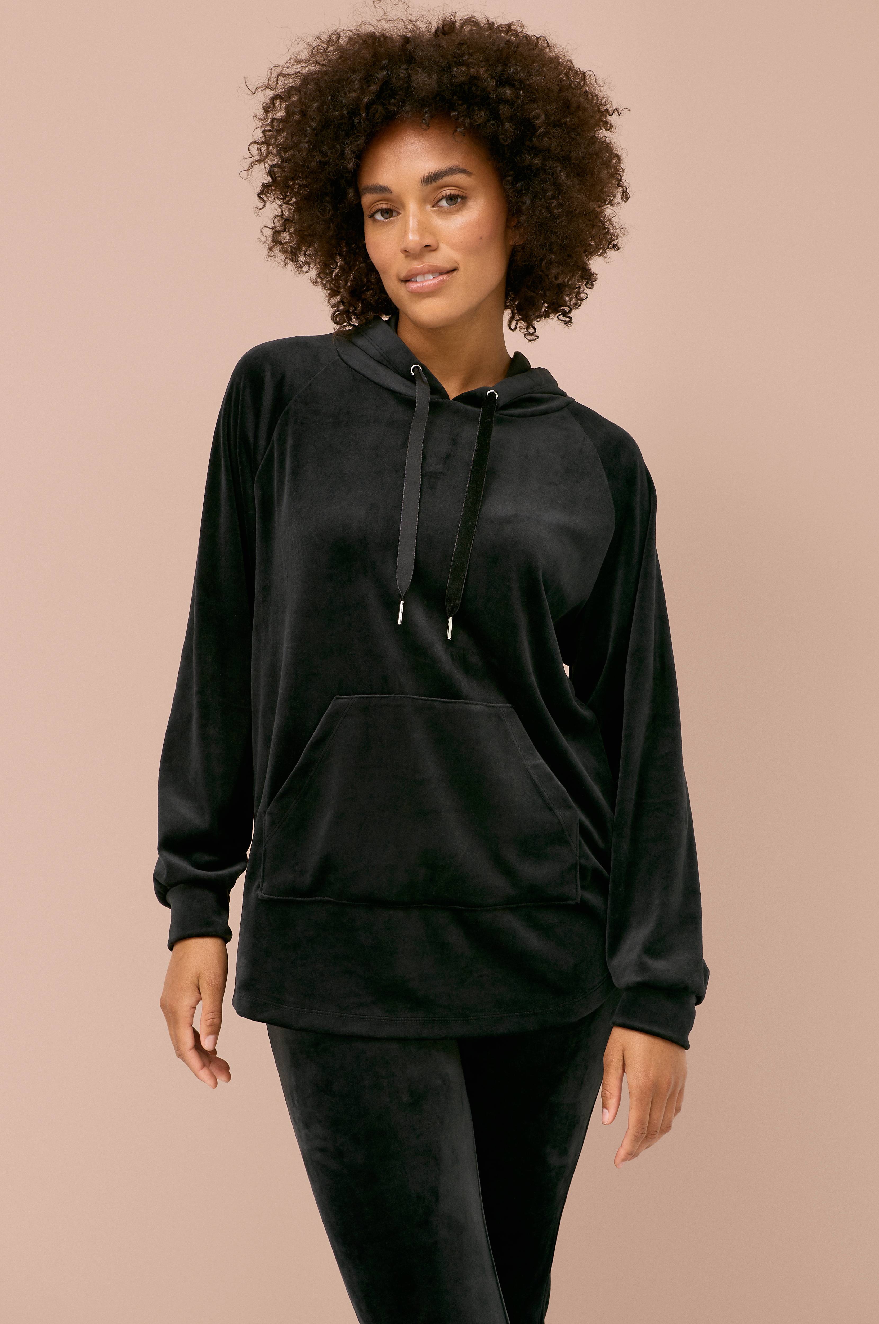 • Længere model i blød velour• Hætte med træksnørre• Kængurulomme• Manchet ved manchetterne• Afrundet søm• Længde: 77 cm i størrelse 38