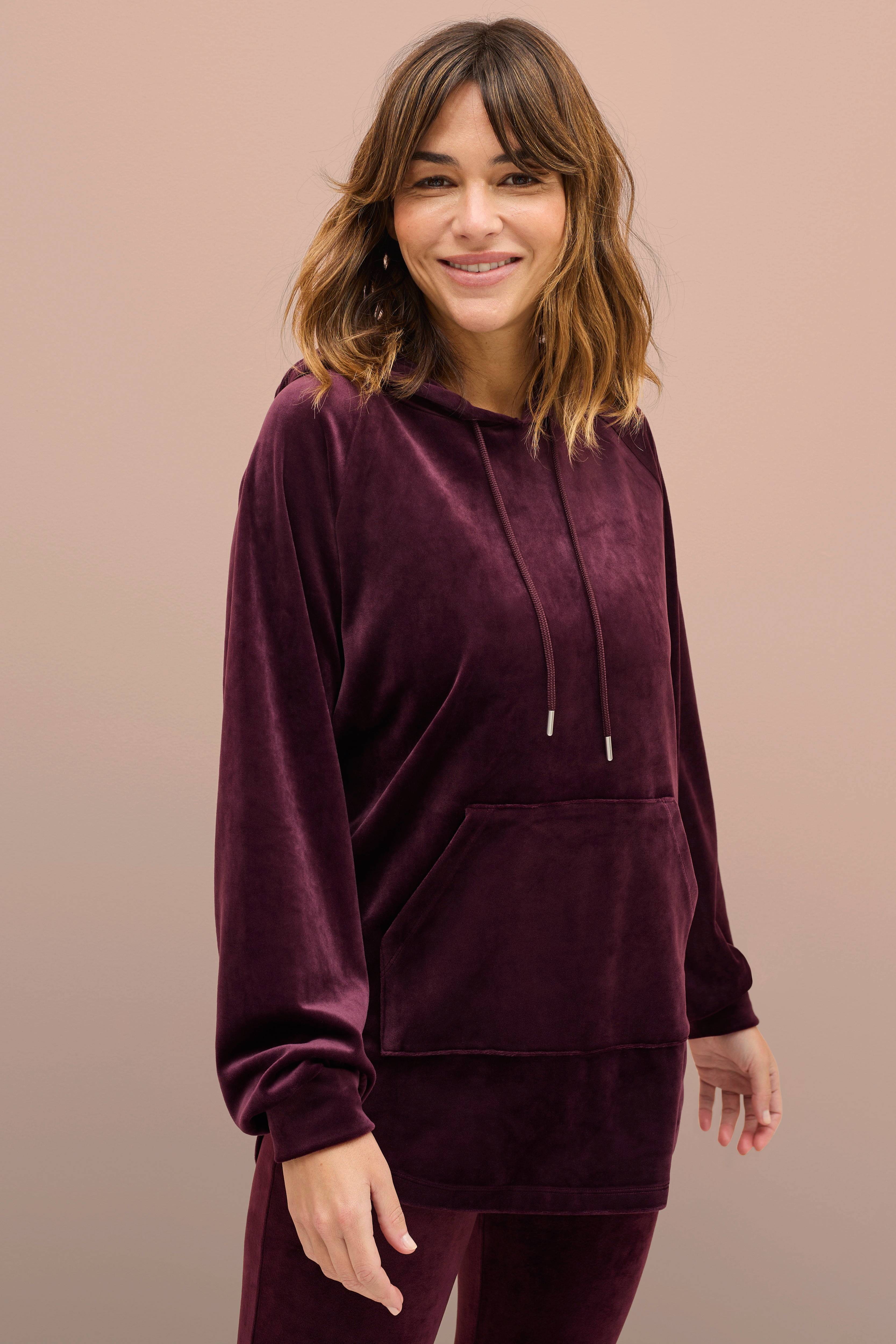 • Længere model i blød velour• Hætte med træksnørre• Kængurulomme• Manchet ved manchetterne• Afrundet søm• Længde: 77 cm i størrelse 38
