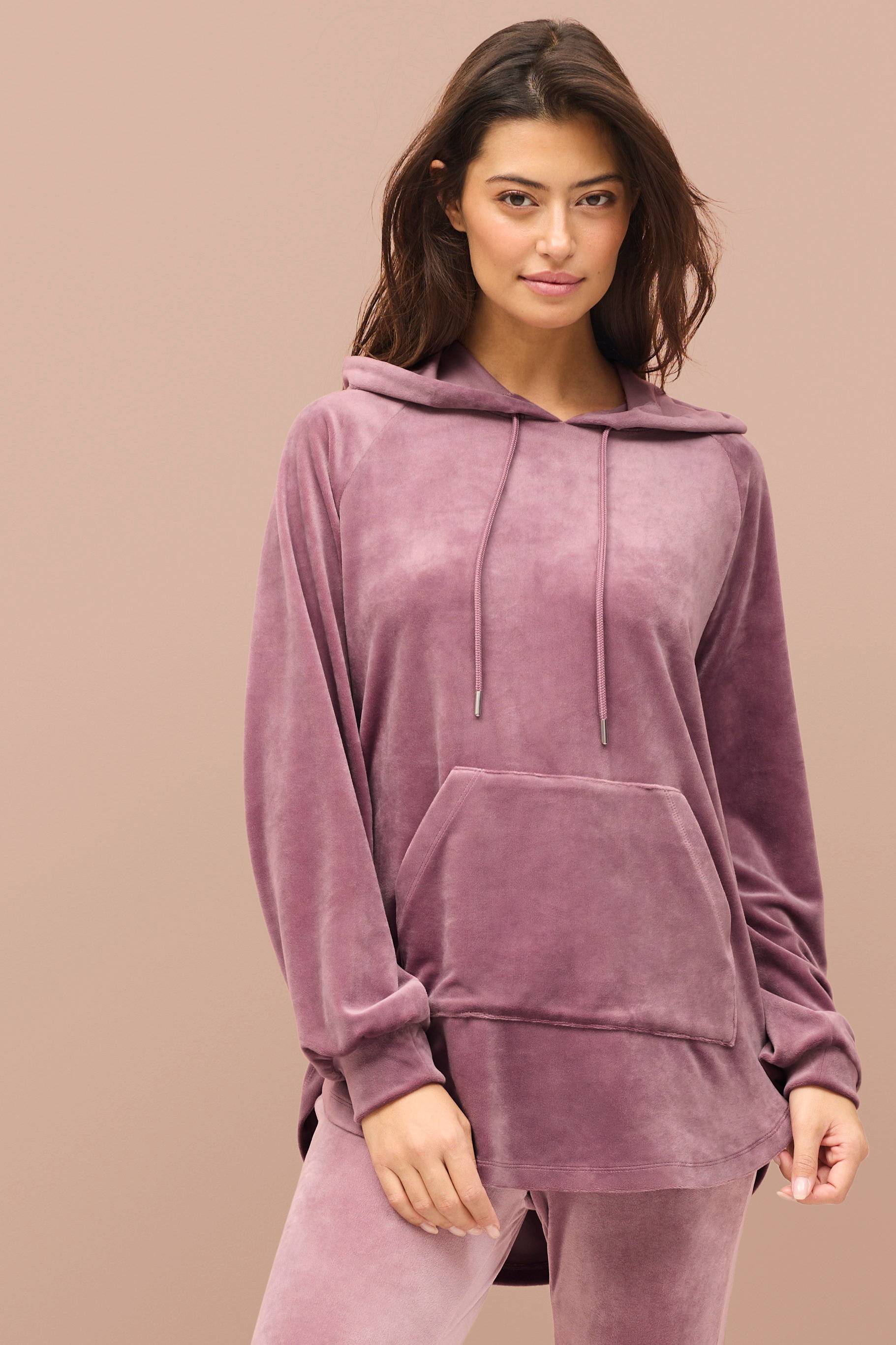 • Længere model i blød velour• Hætte med træksnørre• Kængurulomme• Manchet ved manchetterne• Afrundet søm• Længde: 77 cm i størrelse 38