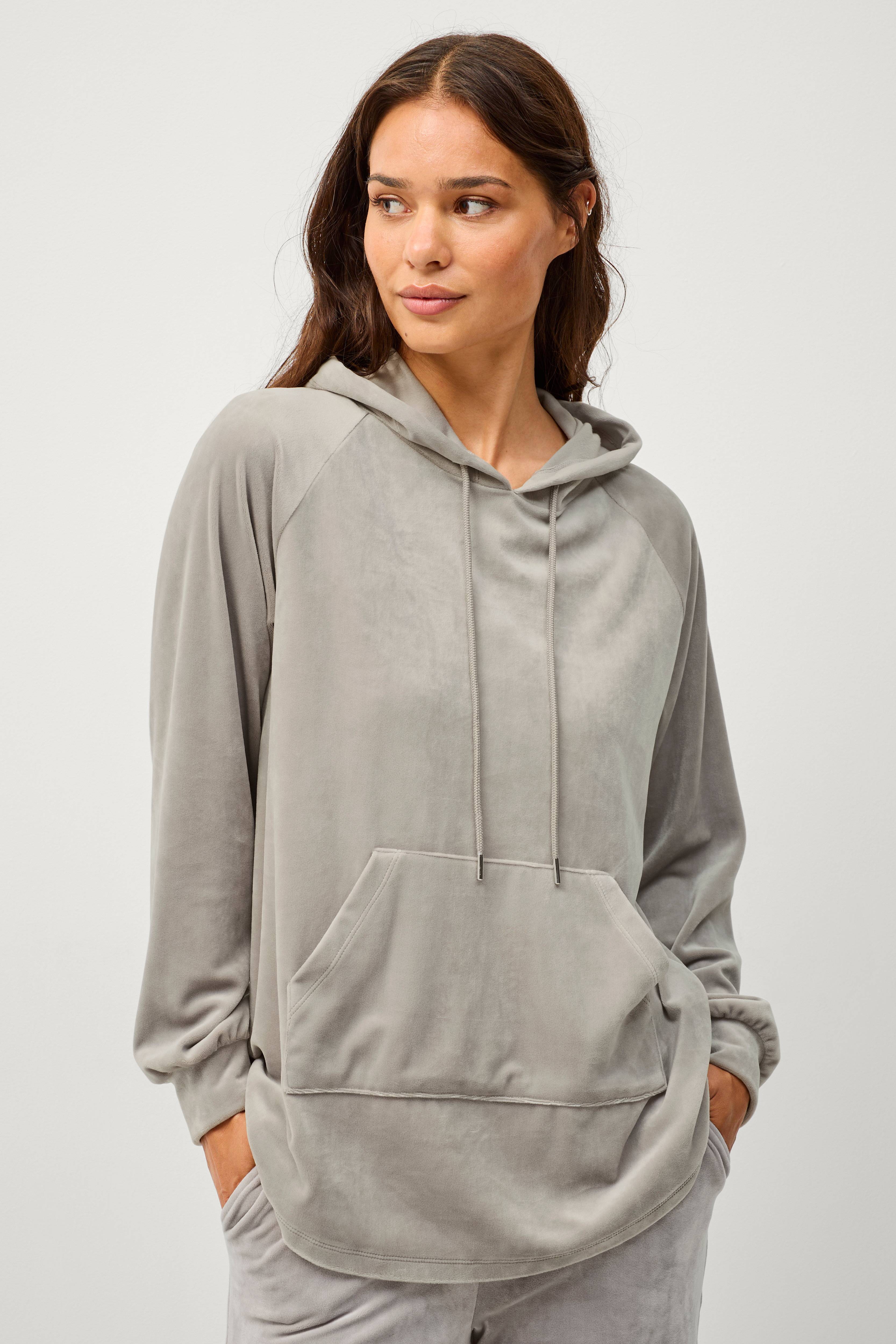• Længere model i blød velour• Hætte med træksnørre• Kængurulomme• Manchet ved manchetterne• Afrundet søm• Længde: 77 cm i størrelse 38