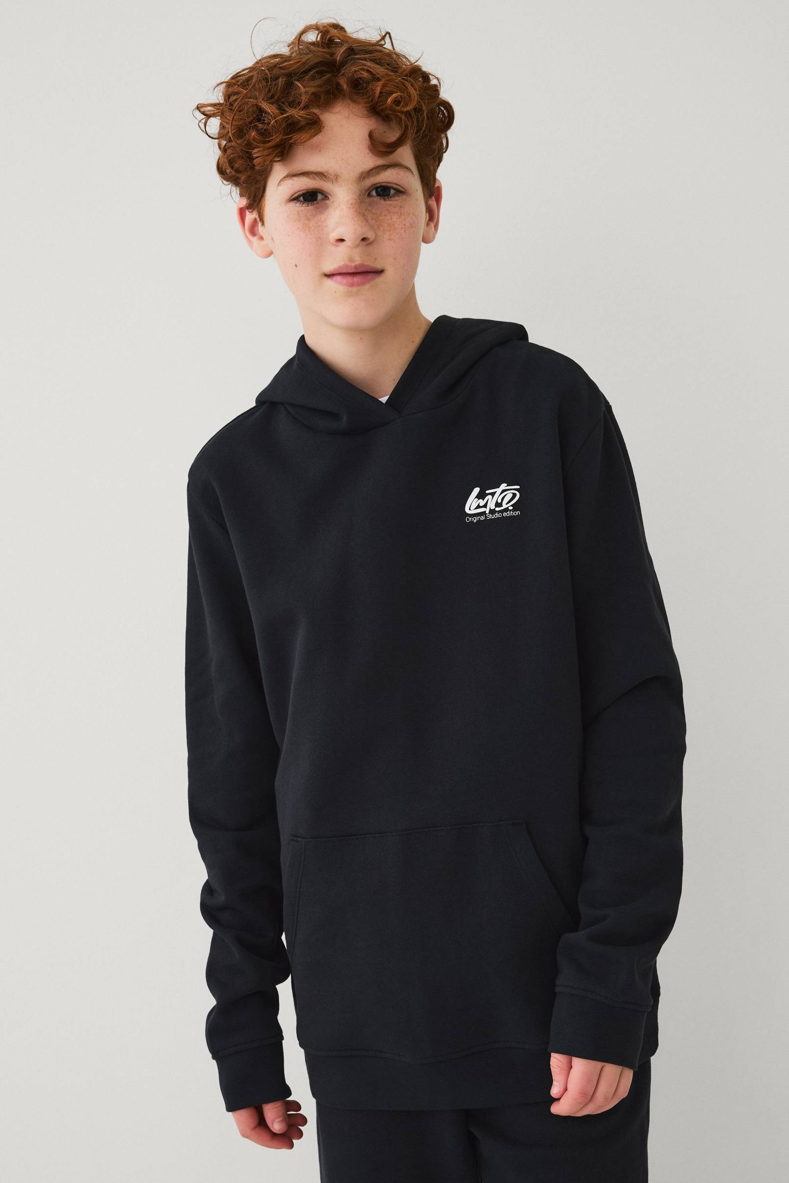 • Hættetrøje med børstet inderside• Tryk foran og på hætten• Kængurulomme• Manchetter ved manchetterne og ved nederste kant