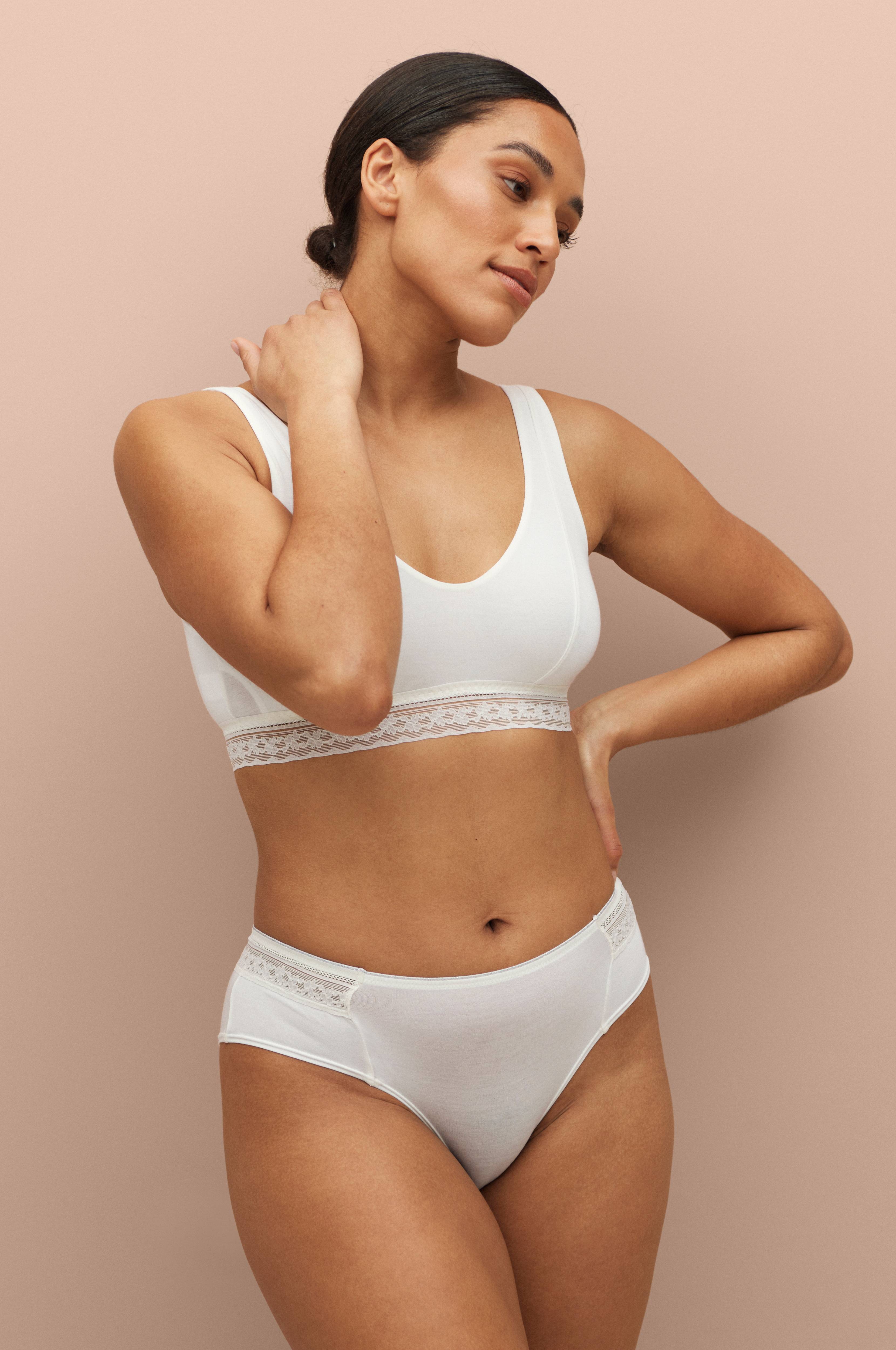 Hipstertrusse i blød modaljersey med bred blonde i taljen bagpå og i siderne. Smal sølvglitrende kant foroven. Foret skridt.