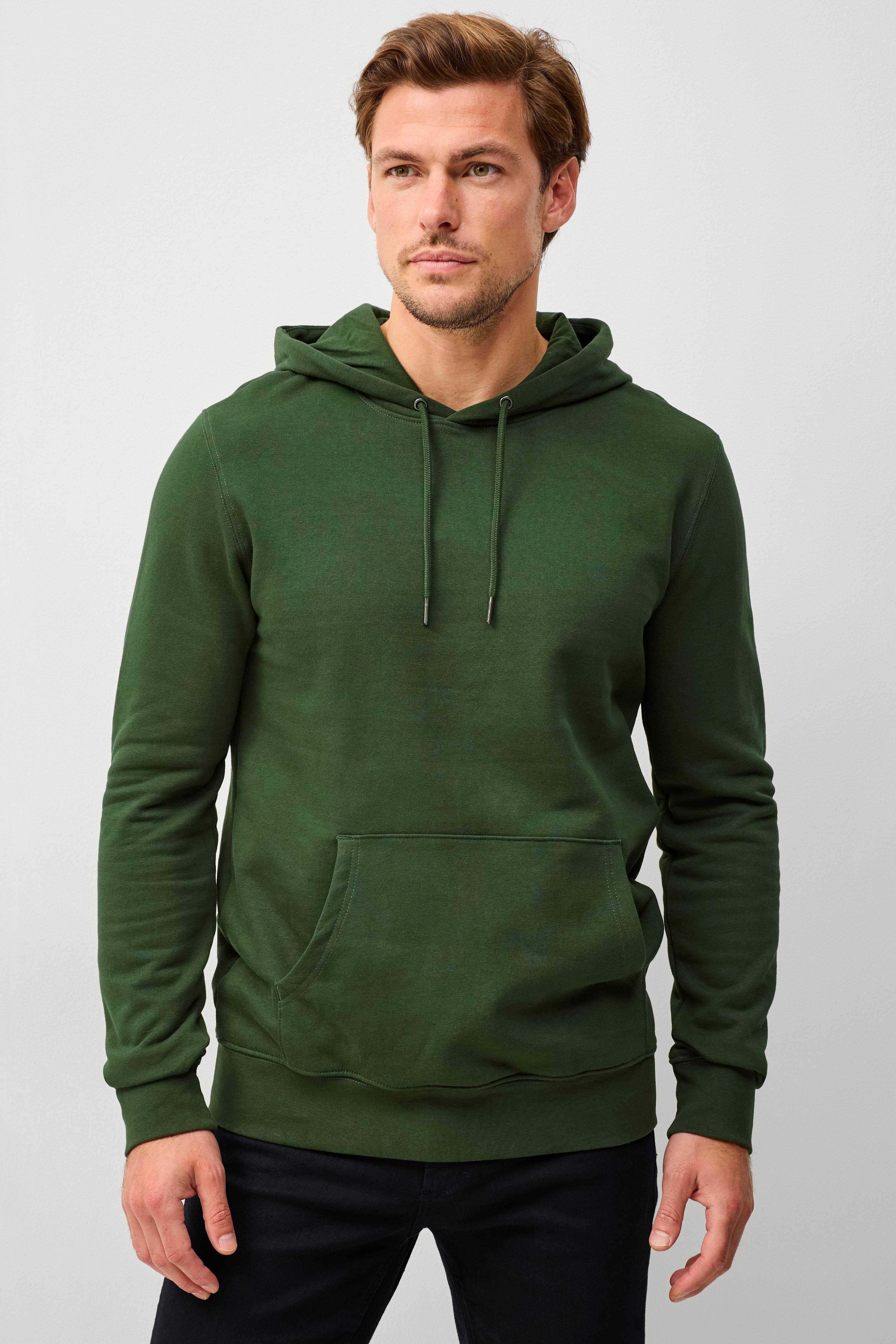 Hættetrøje med blød, børstet inderside. Hætte med løbegang og kængurulomme. Rib i ærmekant og kanten forneden. Længde ca. 73 cm i str. M.