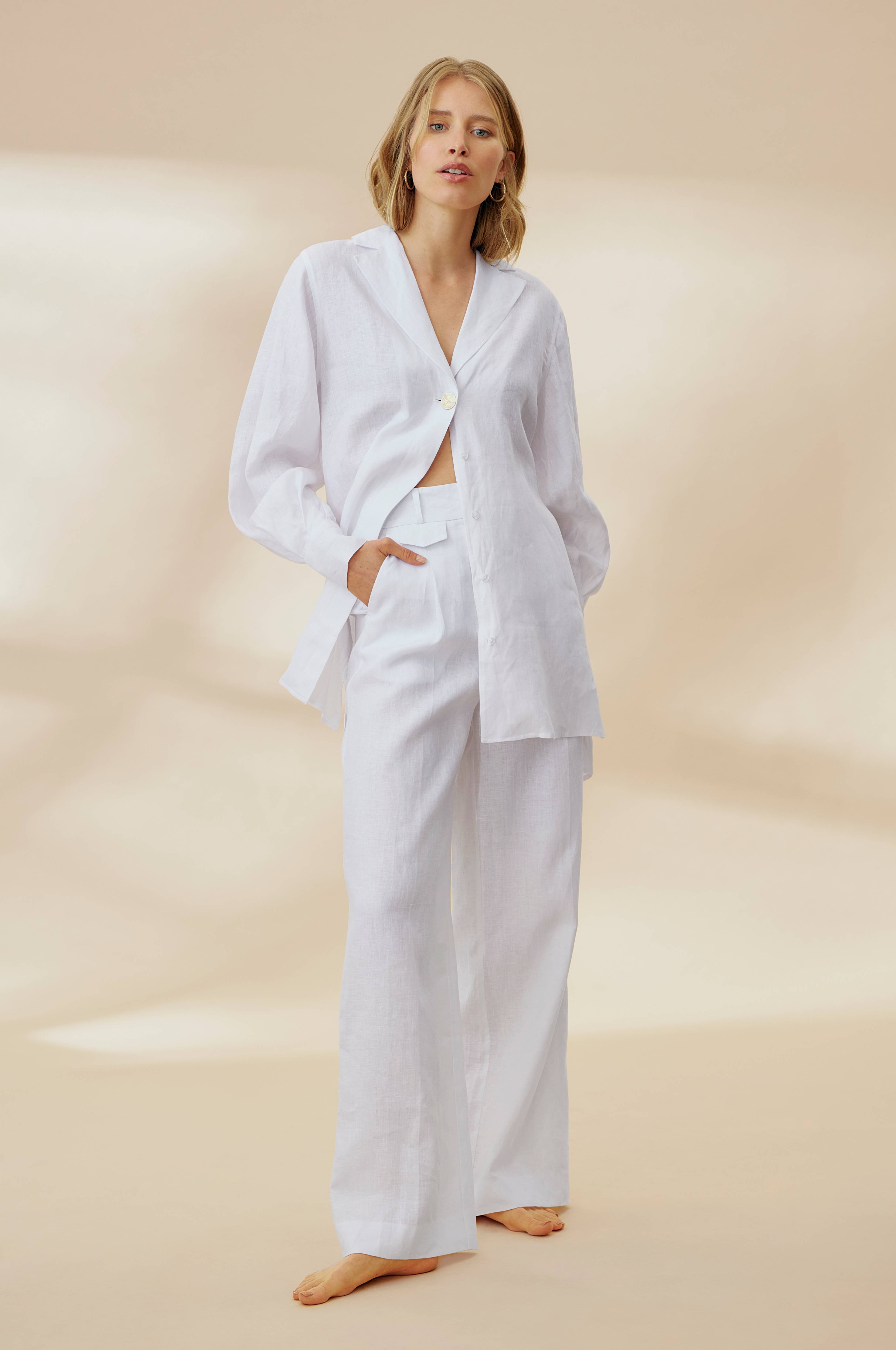 Vide hørbukser med høj talje. To forlommer, to snydelommer bagpå og en lille møntlomme med klap og trykknap foran. Gylp med lynlås og hægte og malle i taljen. I fin hørkvalitet.
