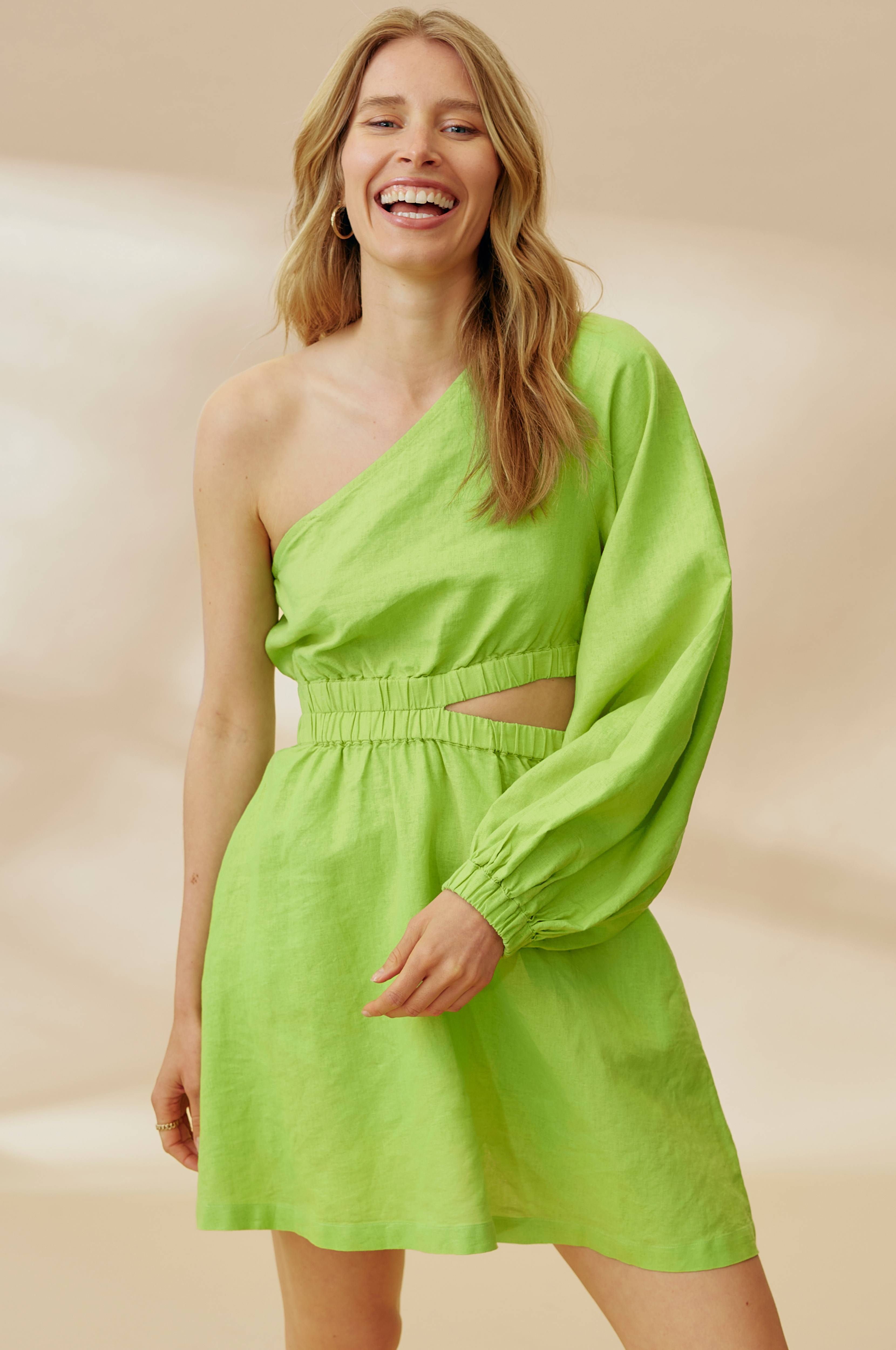 Asymmetrisk kjole med en skulder og cutout i den ene side. Ballonærmer med meget vidde og elastisk ærmekant. Markeret talje med elastik og A-formet nederdel med lommer i siderne. Længde ca. 83 cm i str. 38.