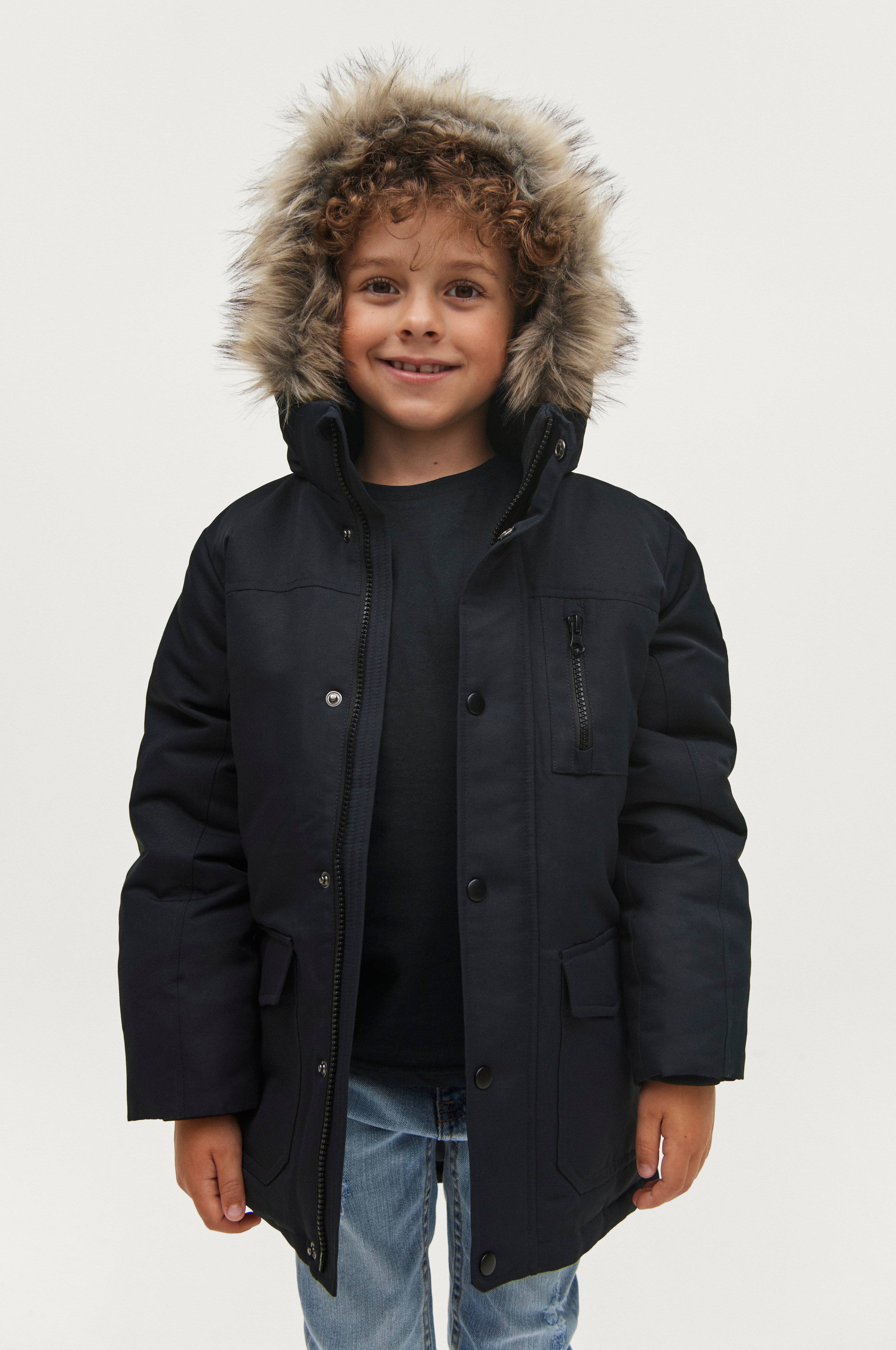 Vatteret jakke med aftagelig hætte. Hætten har en aftagelig kant i kunstpels. Høj krave med ribstrikket inderside. Lynlås og overfald med trykknapper. Rib i ærmekanterne. To yderlommer med velcrolukning og en brystlomme med lynlås. En inderlomme med velcrolukning. Mærke i gummi på venstre ærme.