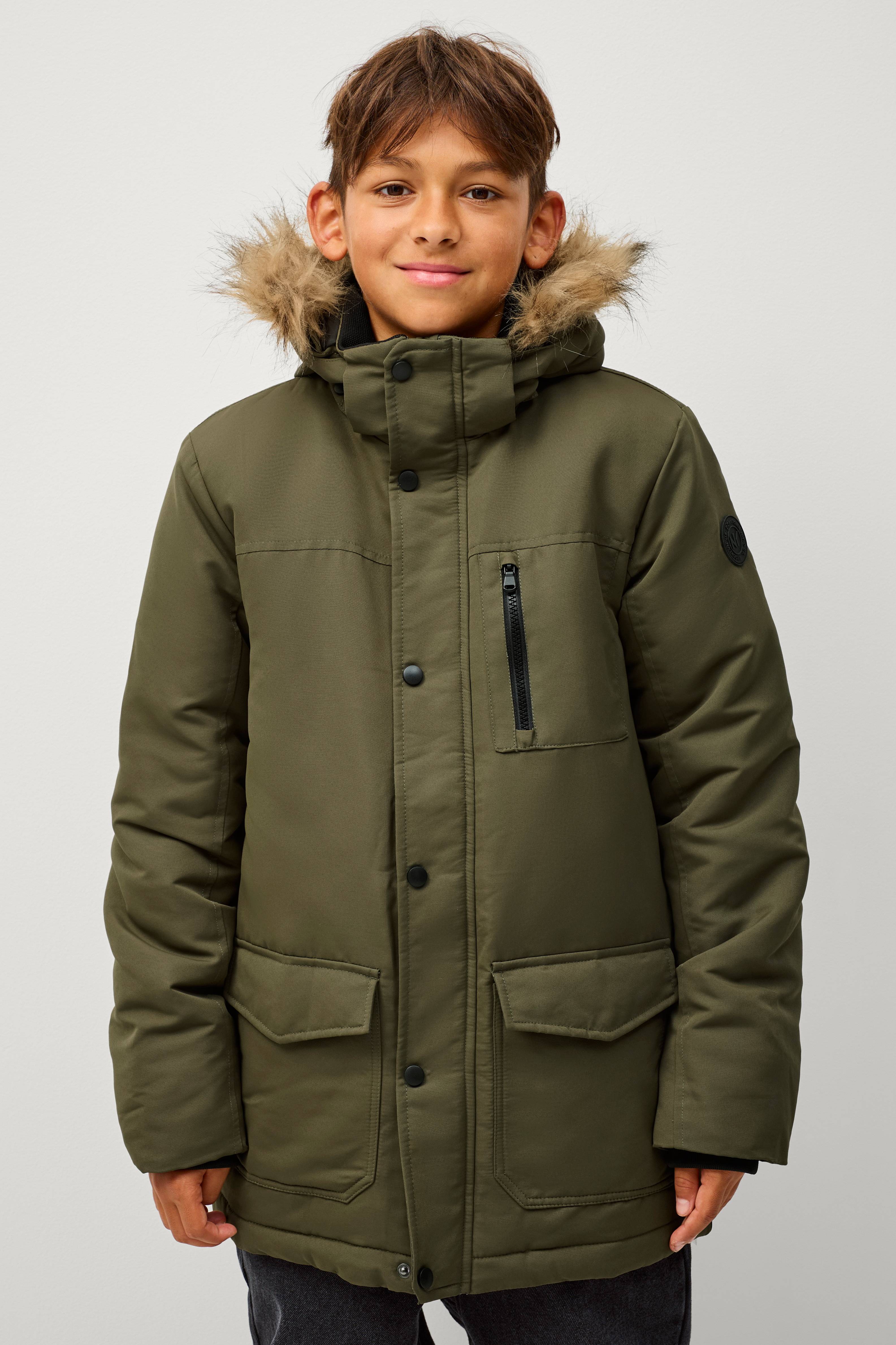 • Foret jakke • Parkamodel • Aftagelig hætte med aftagelig kunstpelskant • Høj krave med ribstrikket inderside • Lynlås • Vindflap over lynlåsen med trykknapper • Ribmanchetter ved manchetterne • To forlommer med lommelåg og trykknap • Brystlomme med lynlås • En inderlomme med velcrolukning