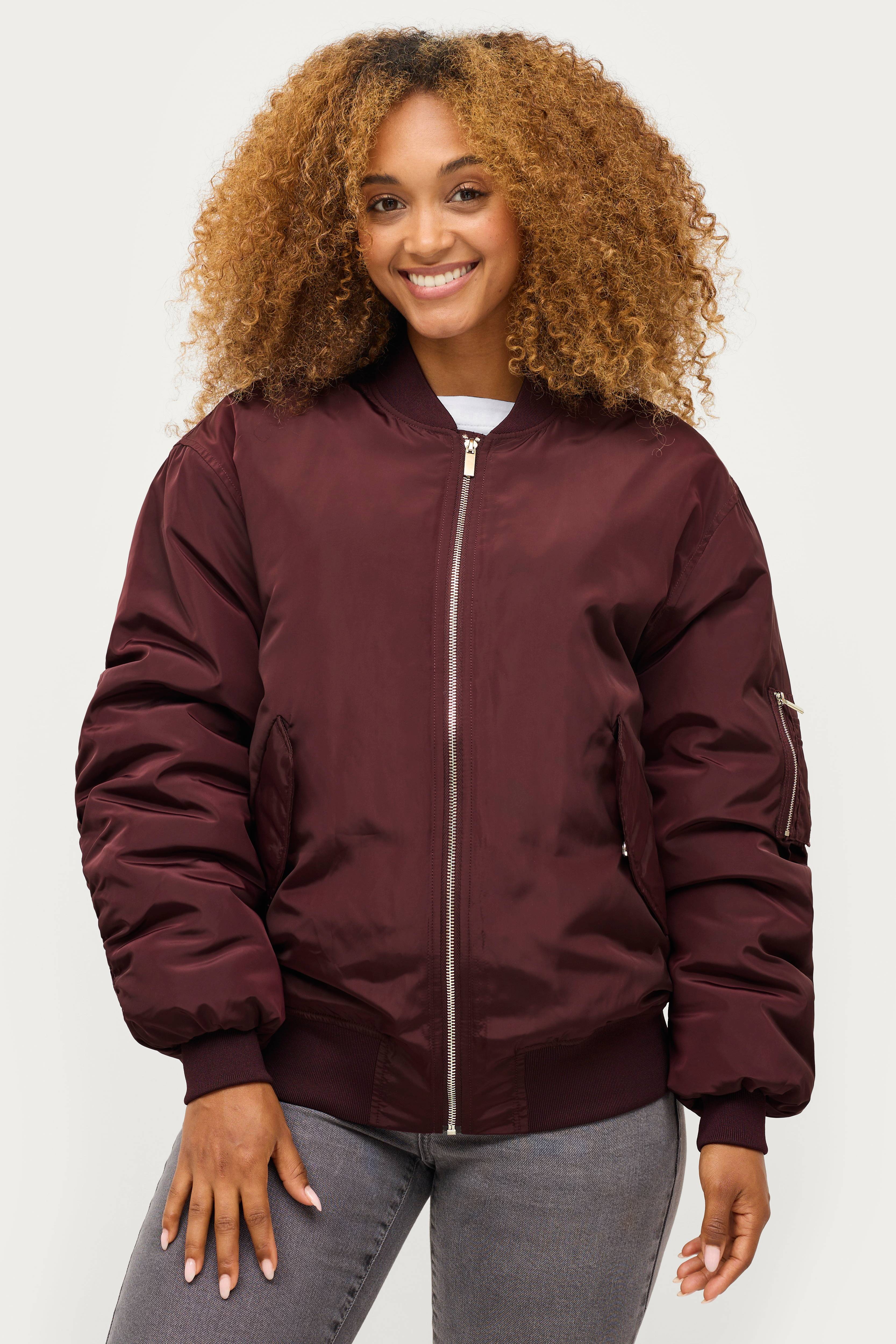 • Let foret bomberjakke • Skinnende ydermateriale • Oversize pasform • Ribbet krave • Lynlås • To lommer med trykknapslukning • Ærmelomme med lynlås • Ribmanchetter ved manchetterne og nederst • Sømme med samling på ærmerne og på ryggen • Længde: 74 cm i størrelse 38/40