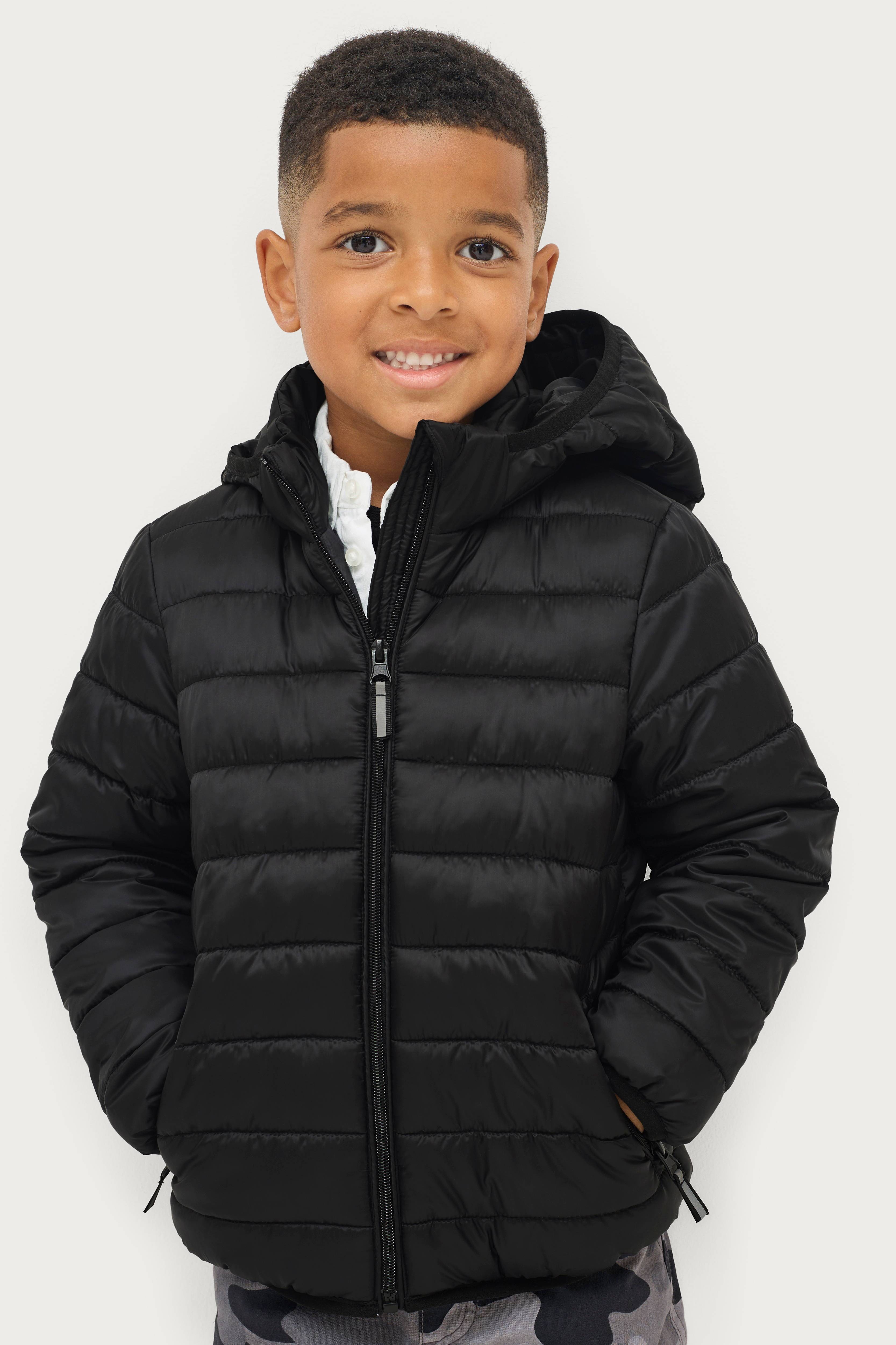 En quiltet jakke med let vattering og aftagelig hætte. Høj krave, lynlås og to lommer med lynlås. Elastisk kantbånd i hætte, ærmekant og forneden. Refleksdetaljer foran.