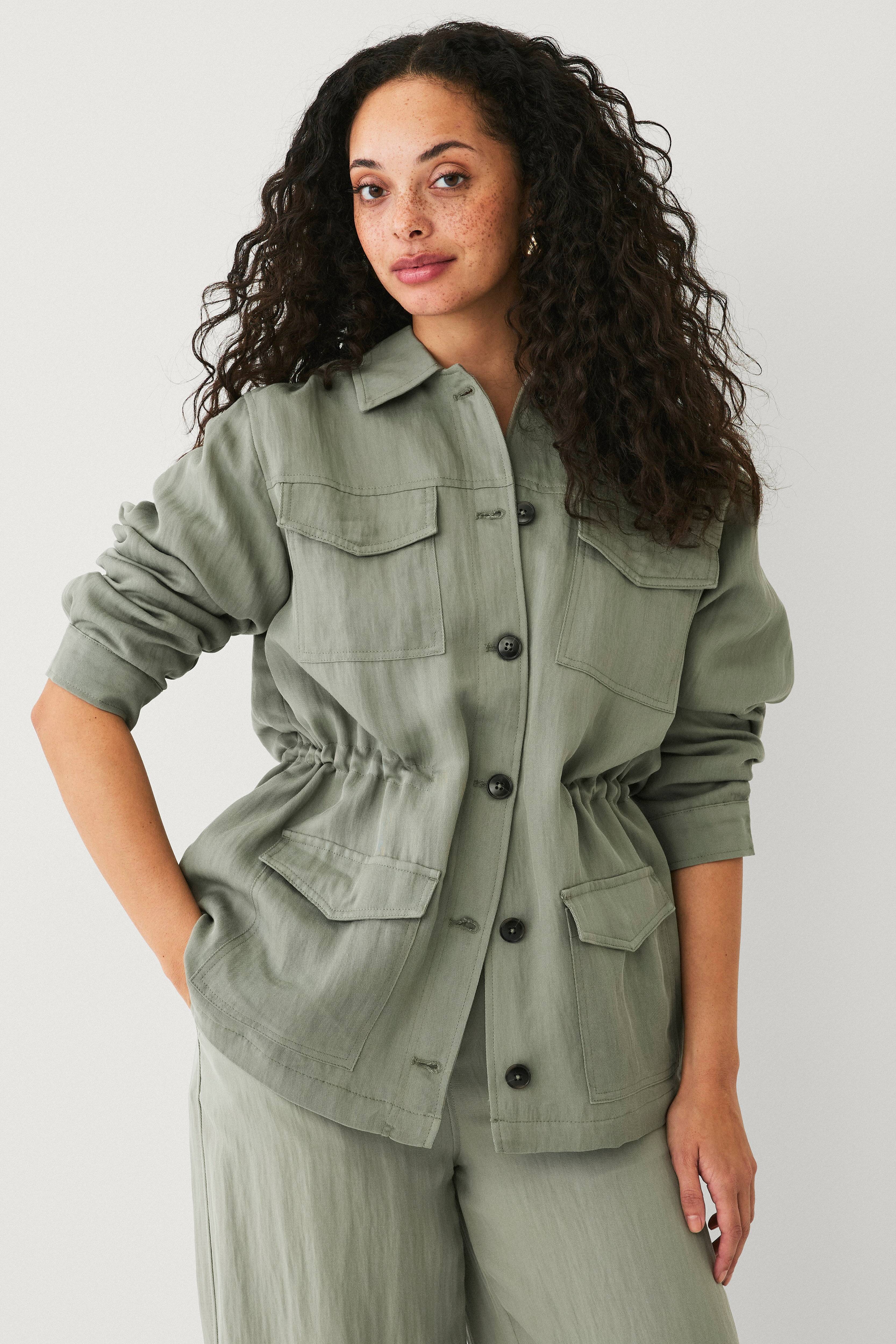 • Let, foret med tekstil, langærmet jakke med synlige knapper ved fronten