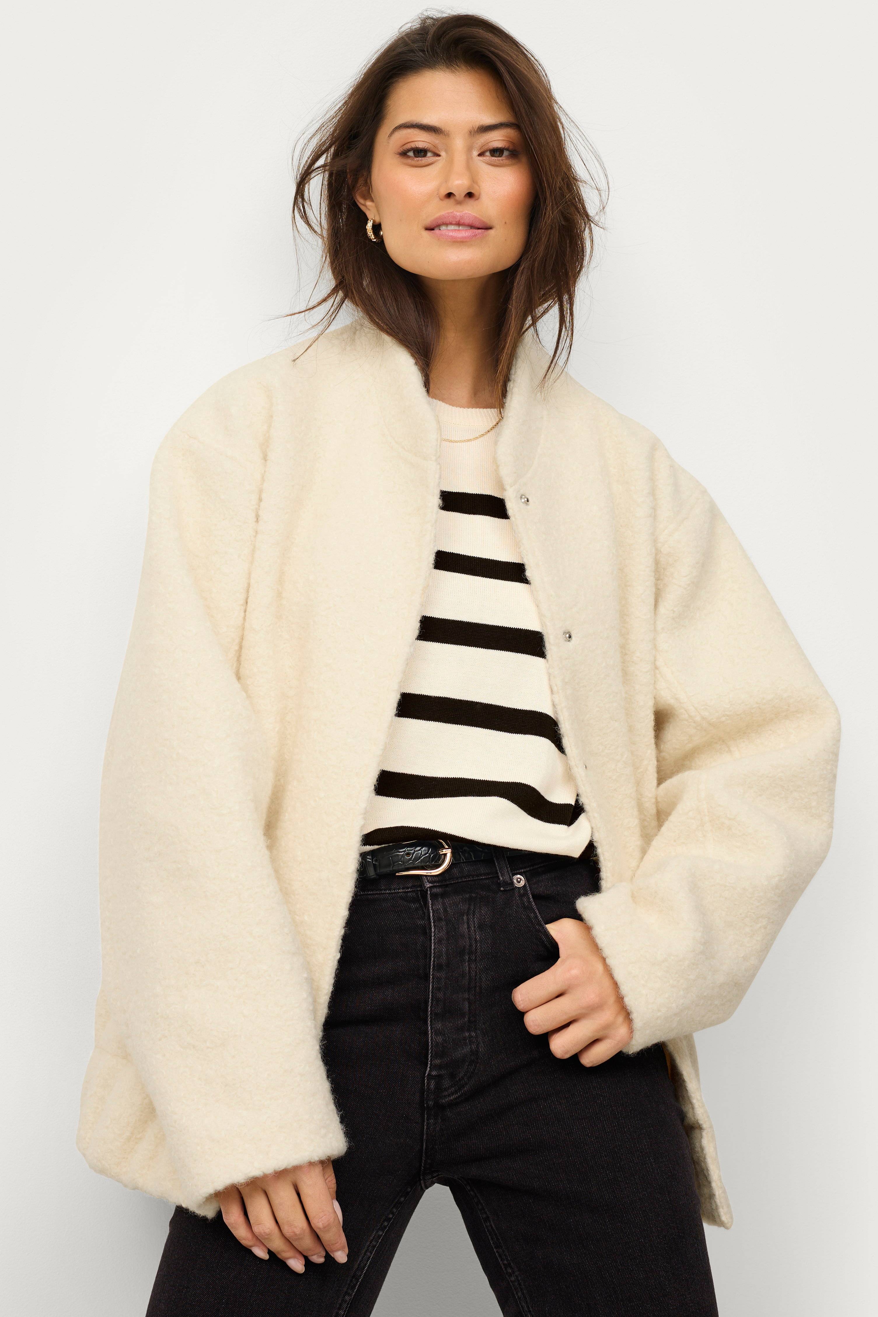 • Bomberjakke • Filtet kvalitet • Skjulte trykknapper • Halvhøj krave • Indlagte lommer • Bredt elastisk bånd nederst • Foret • Længde: 70 cm i størrelse 38/40 • Produktet indeholder genindvundet materiale, som genbruges for at reducere mængden af affald samtidigt med at der ikke anvendes nye ressourcer.