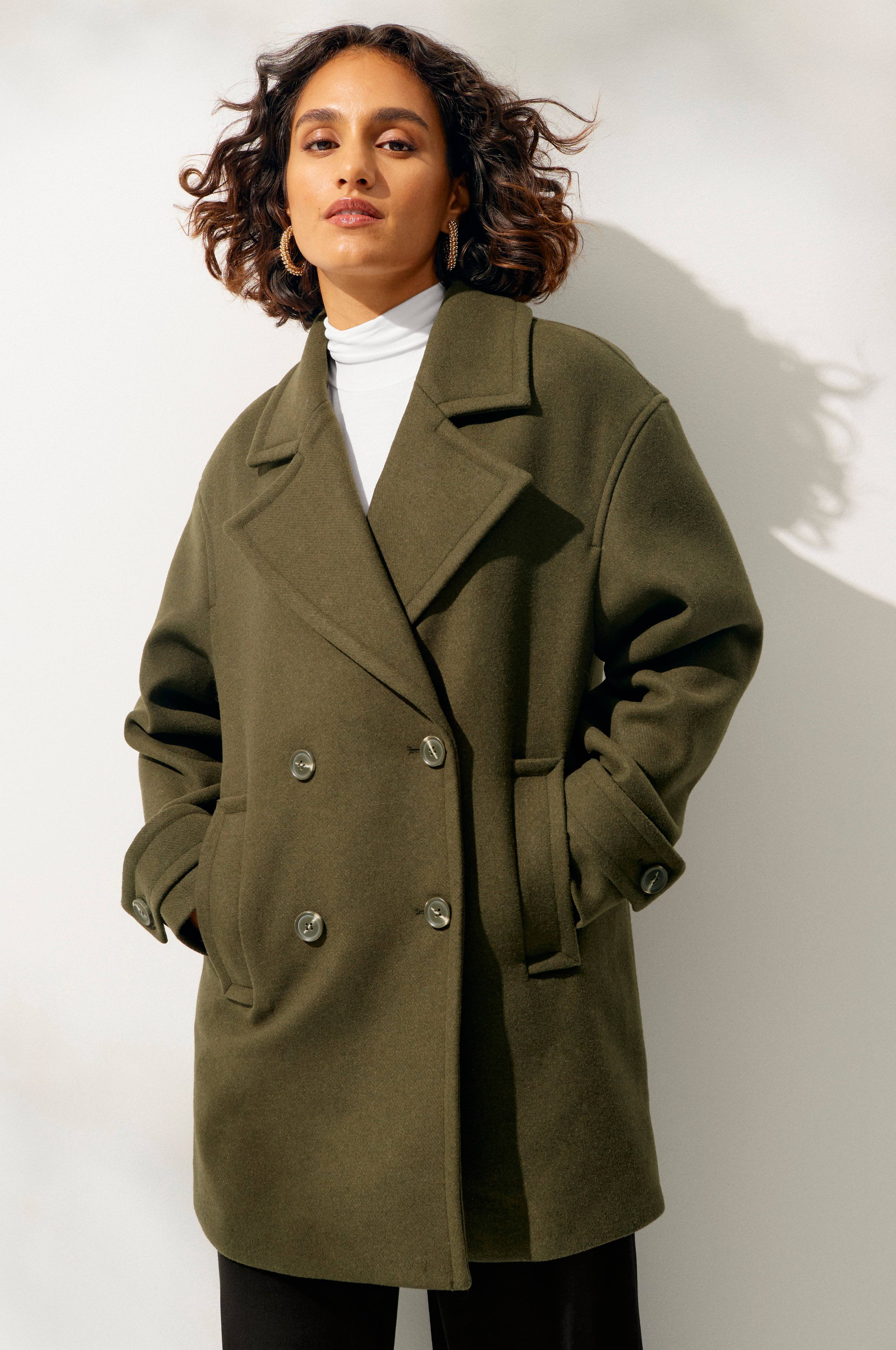 Skipperjakke/frakke i kort model med stor revers. Filtet kvalitet i uldblanding. Lukkes med to knapper. To sidelommer. Glat, vævet for. Længde ca. 82 cm i str. 34/36.