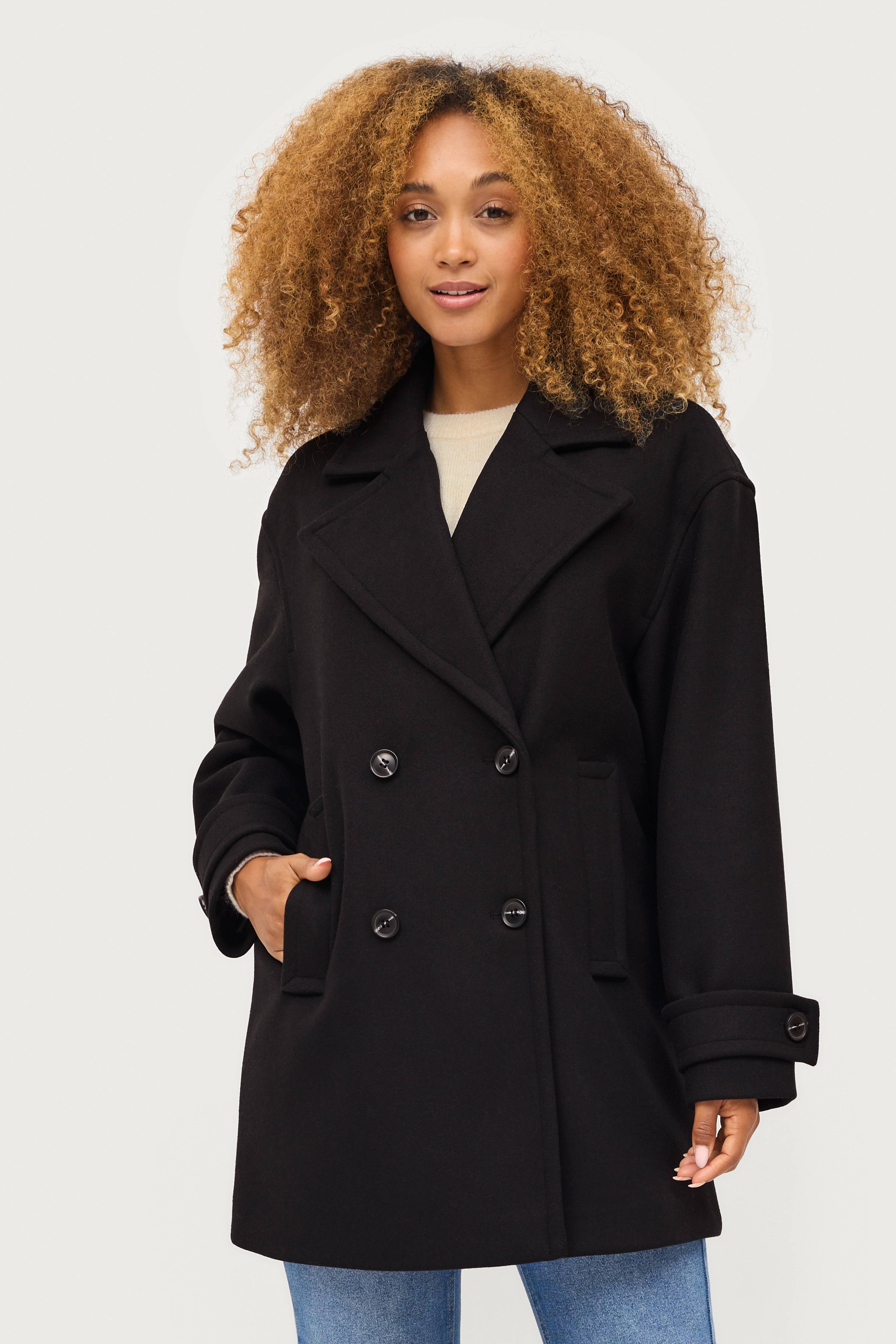 Skipperjakke/frakke i kort model med stor revers. Filtet kvalitet i uldblanding. Lukkes med to knapper. To sidelommer. Glat, vævet for. Længde ca. 82 cm i str. 34/36.