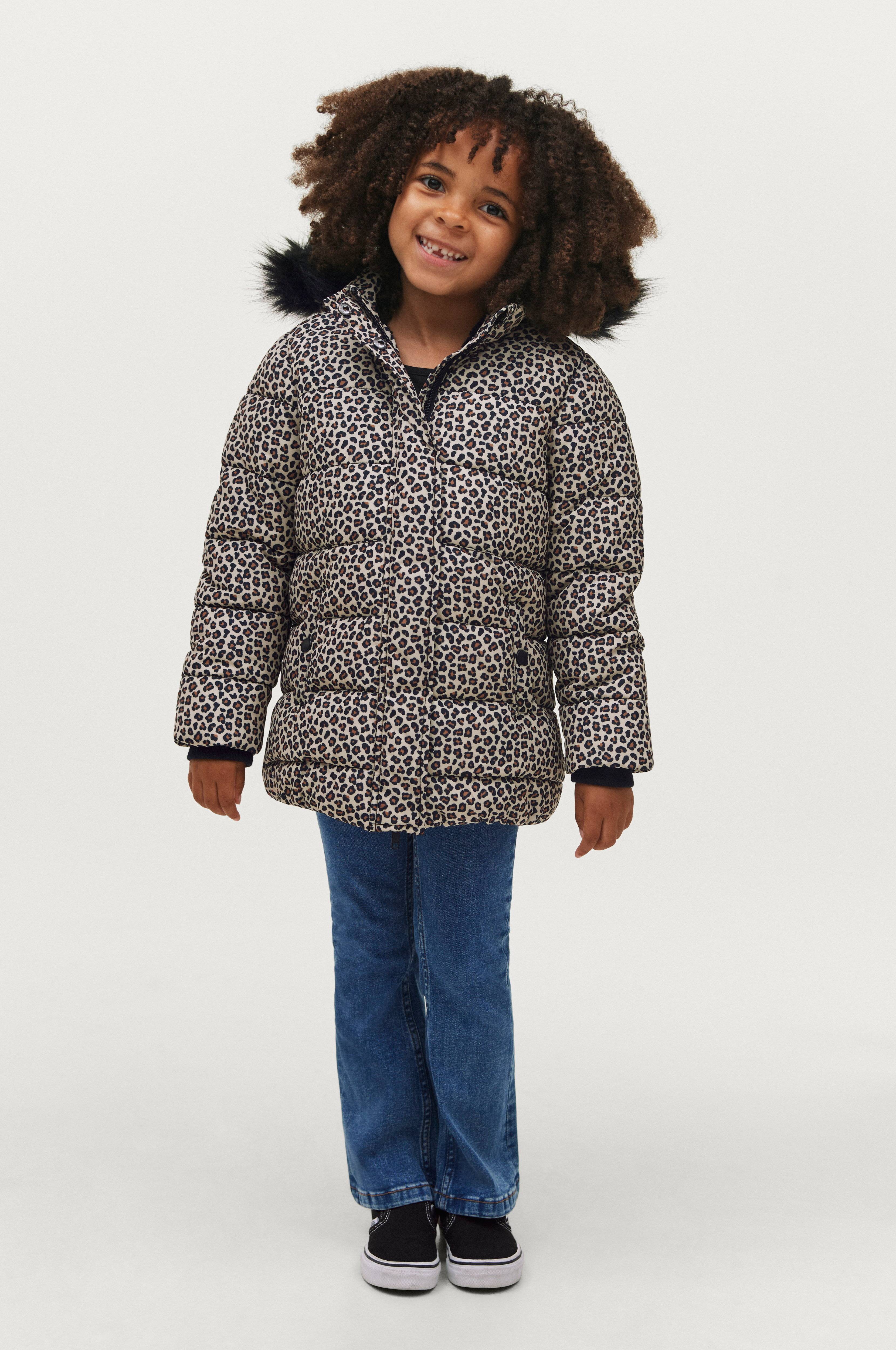 Quiltet og vatteret jakke med printet mønster. Hætten og overdelen i jakken har et for i blød plys. Glat vævet for i resten af jakken. Aftagelig hætte med aftagelig kant af kunstpels. Høj krave, 2-vejslynlås og overfald med trykknapper. Indvendig løbegang med stop i taljen. Ribstrikkede kanter i ærmet. To lommer med trykknap og elastik i kanten forneden.