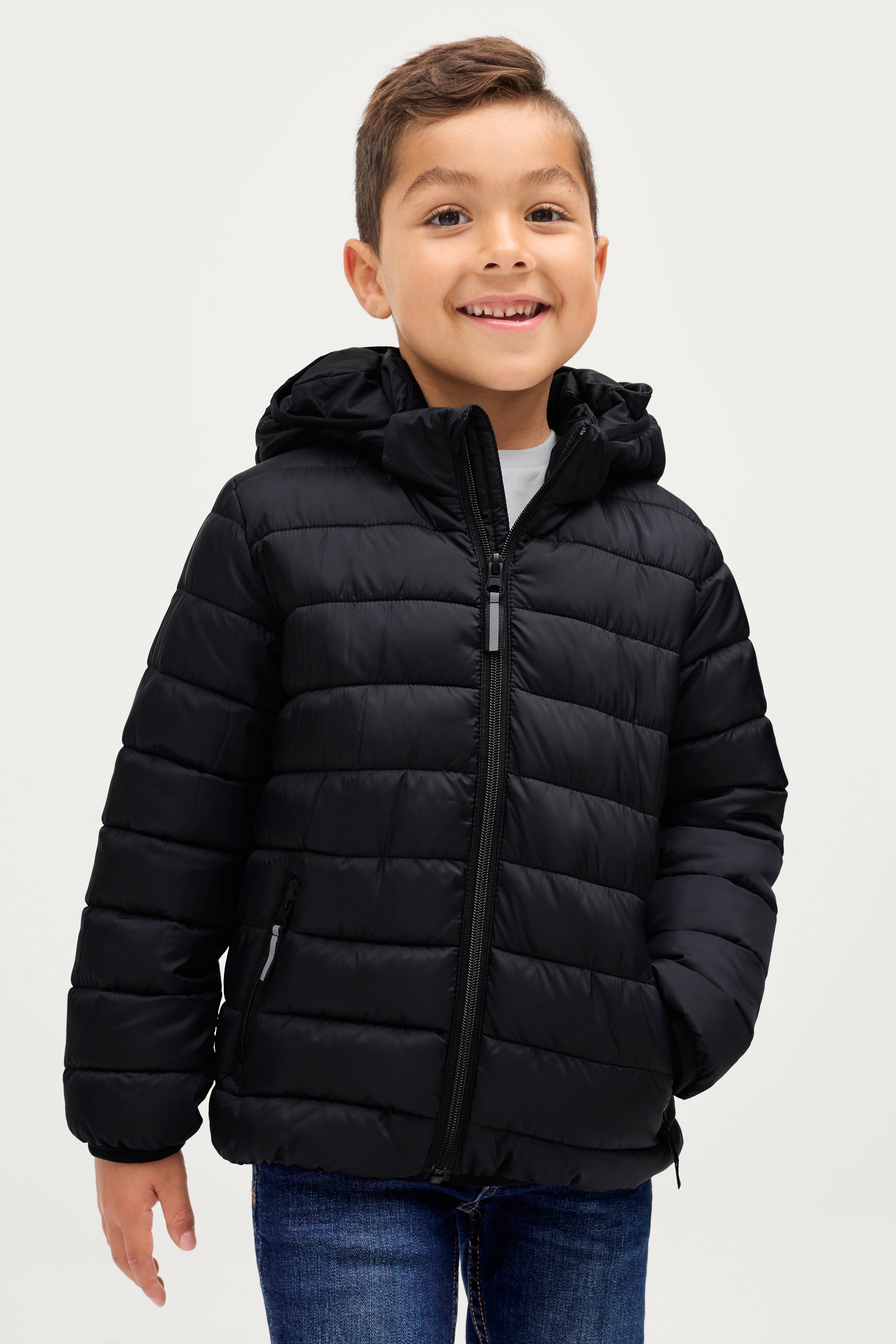 En quiltet jakke med let vattering og aftagelig hætte. Høj krave, lynlås og to lommer med lynlås. Elastisk kantbånd i hætte, ærmekant og forneden. Refleksdetaljer foran.