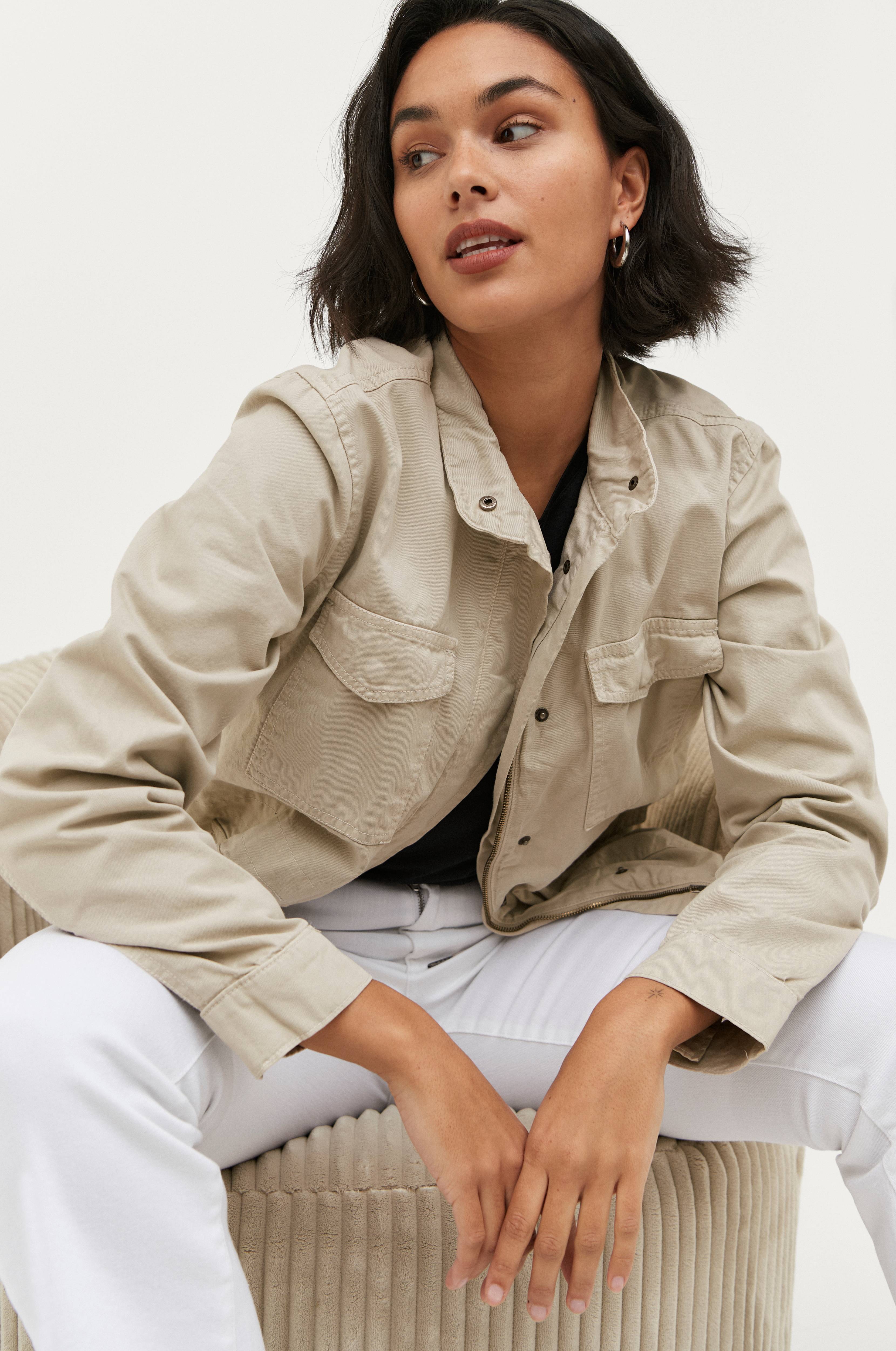 Jakke i kraftig vævet bomuld med tyndt for. Lynlås og overfald med trykknapper foran samt fire lommer med klap og trykknap. Justerbar talje med indvendig løbegang. Ståkrave. Længde ca. 67 cm i str. 36.