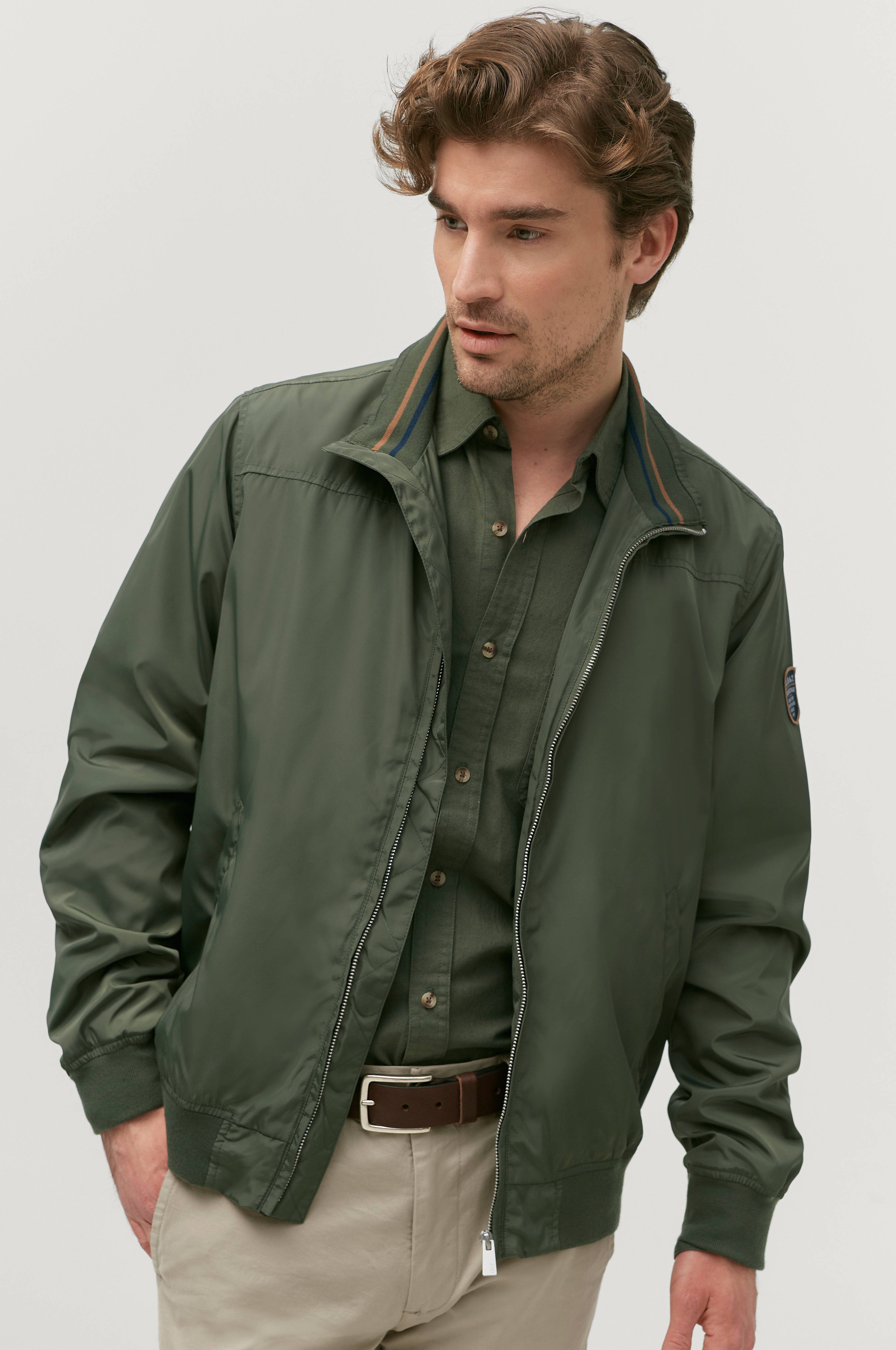 Jakke Samuel fra On Our Terms i vævet, blankt stof. Høj krave med ribstrikket inderside. Lynlås og to lommer med lynlås. En inderlomme med lynlås. Rib i ærmekant og forneden. Vævet for. Længde ca. 68 cm i str. M.