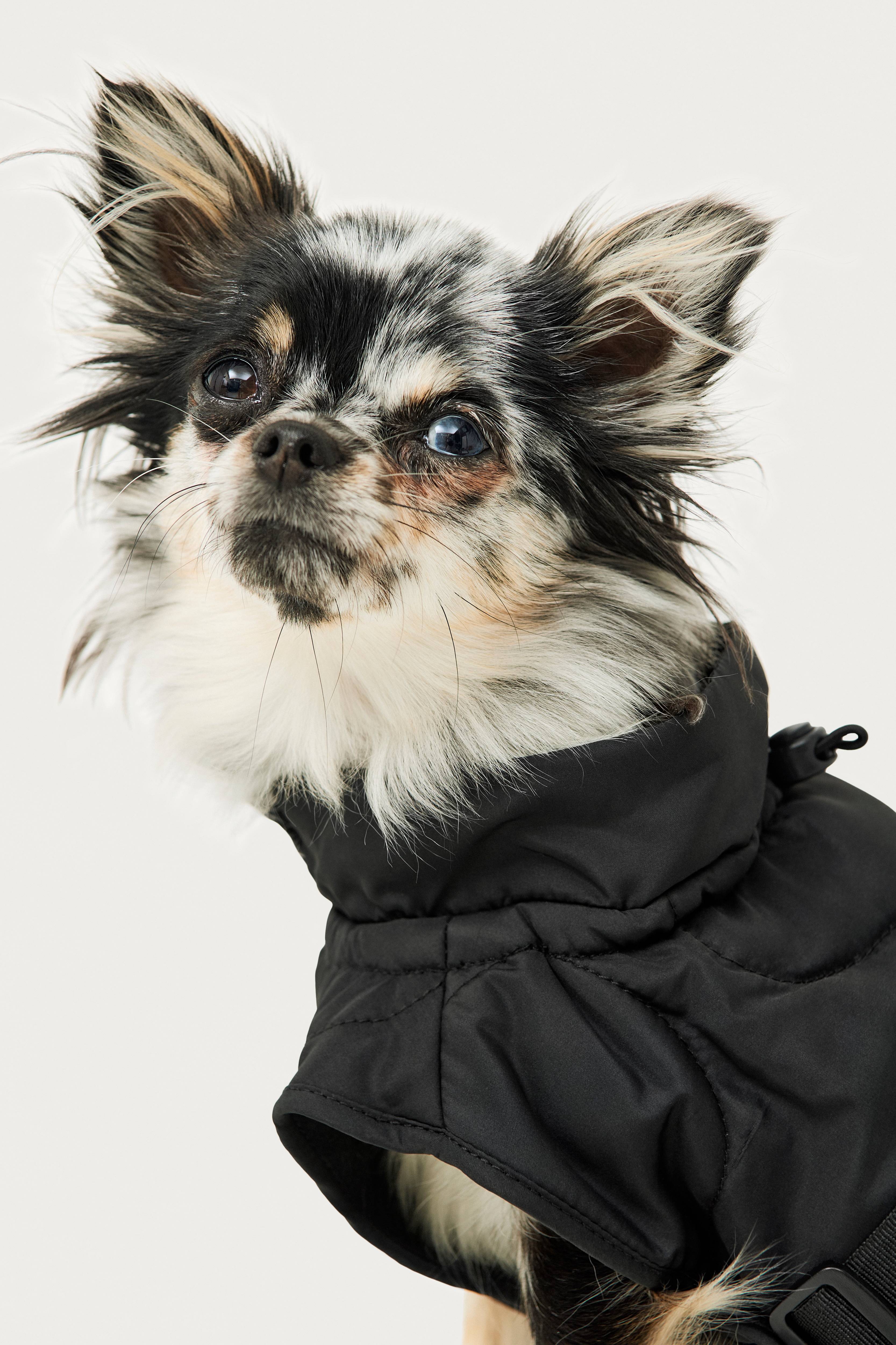 Tyndt vatteret jakke til hund i vævet stof med quiltet mønster og blød fleece på indersiden. Justerbar lukning og to elastikbånd forneden.