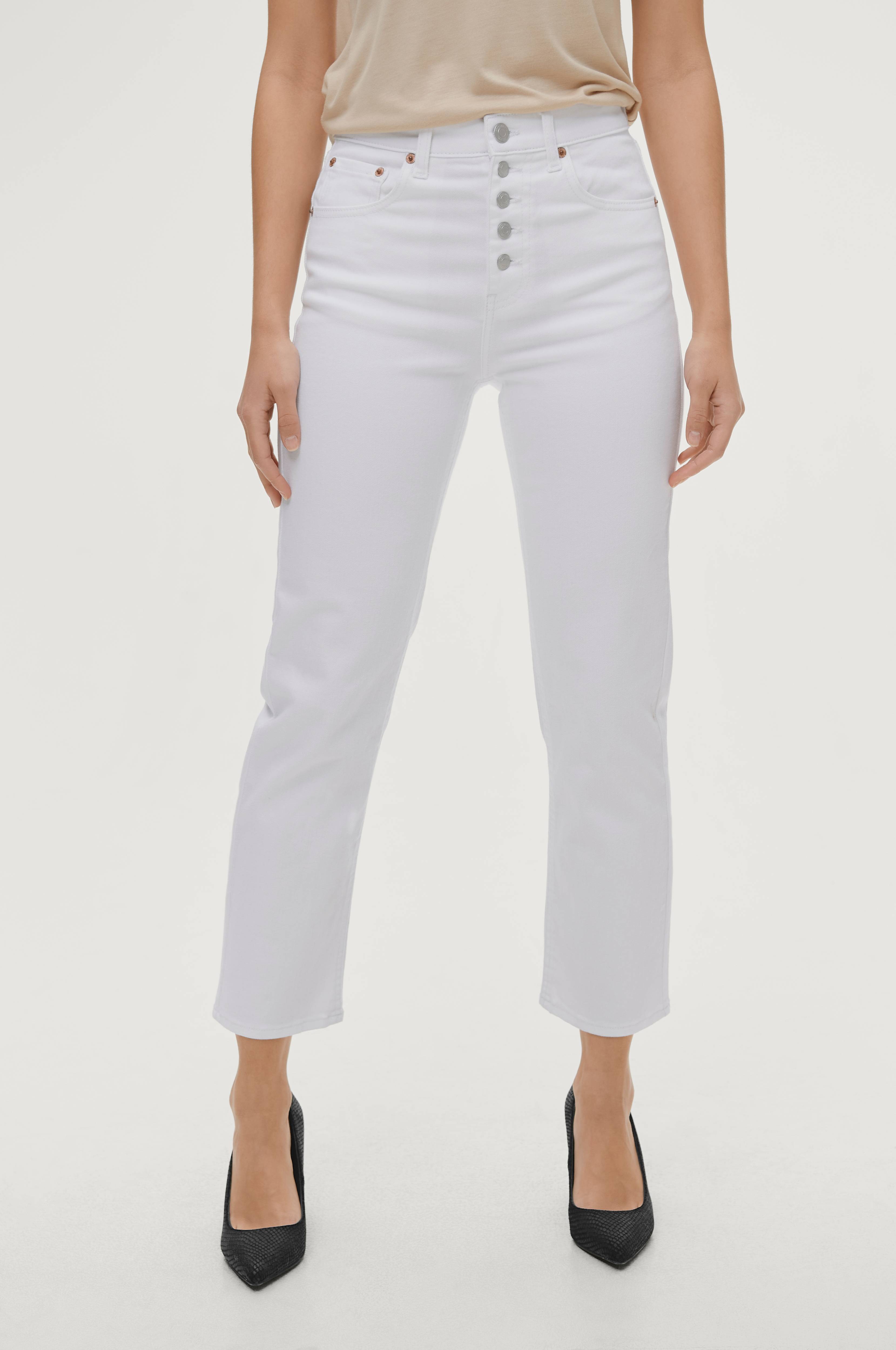 Jeans Lotta Vintage med høj talje og lige, ankellange ben og slidte effekter ved lommerne og i benkant. 5-lommemodel med synlig knapgylp. Fremstillet af blød stretchdenim. Indvendig benlængde ca. 68 cm i str. 36.