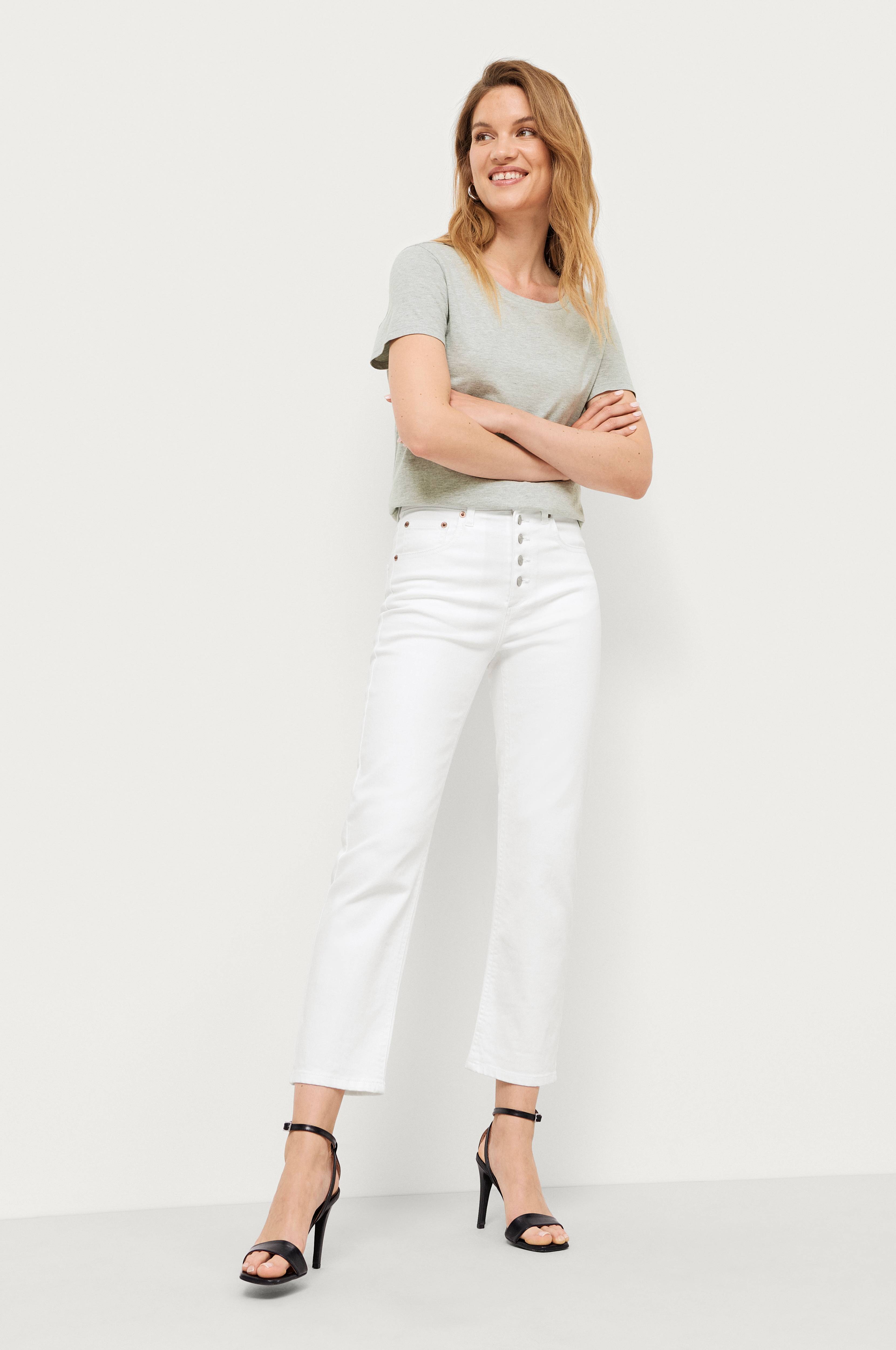 - Disse jeans er produceret med Jeanologias Laser- og E-Flow-teknologi. Processerne reducerer i høj grad forbruget af el, vand og kemikalieforbrug i farvning, vask og finish sammenlignet med traditionelle metoder. Fordelen ved laser er, at det kan skabe slidte effekter på stoffet i stedet for at bruge andre metoder, der kan være skadelige for miljøet og sundheden, f.eks. kemikalier, slidte effekter lavet i hånden og sandblæsning.