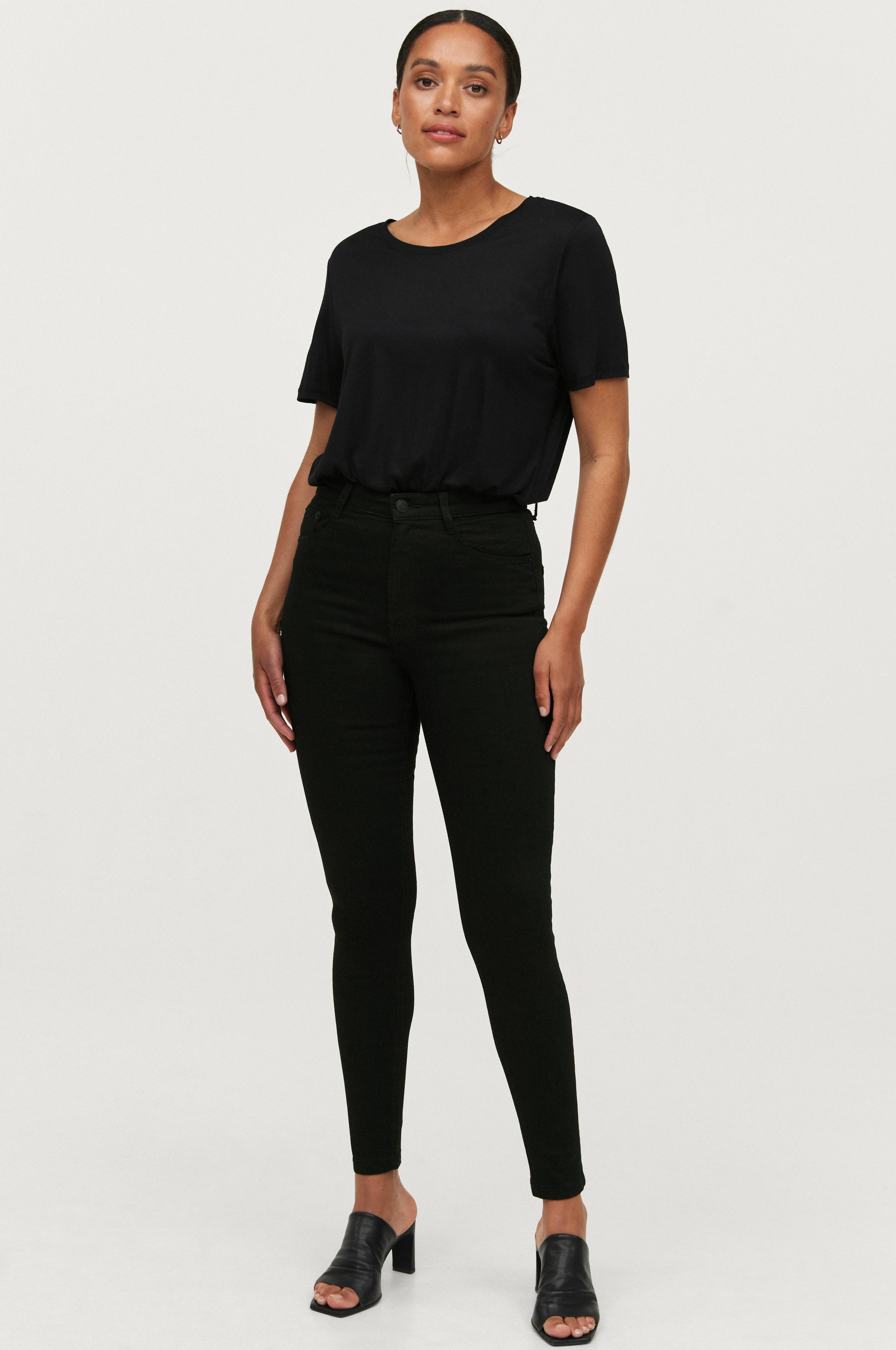 Jeans Mandy Supersoft med høj talje og smalle ben. 5-lommemodel med lynlås i gylpen. I blød kvalitet med meget stretch. Benlængde ca. 75 cm i str. 36.