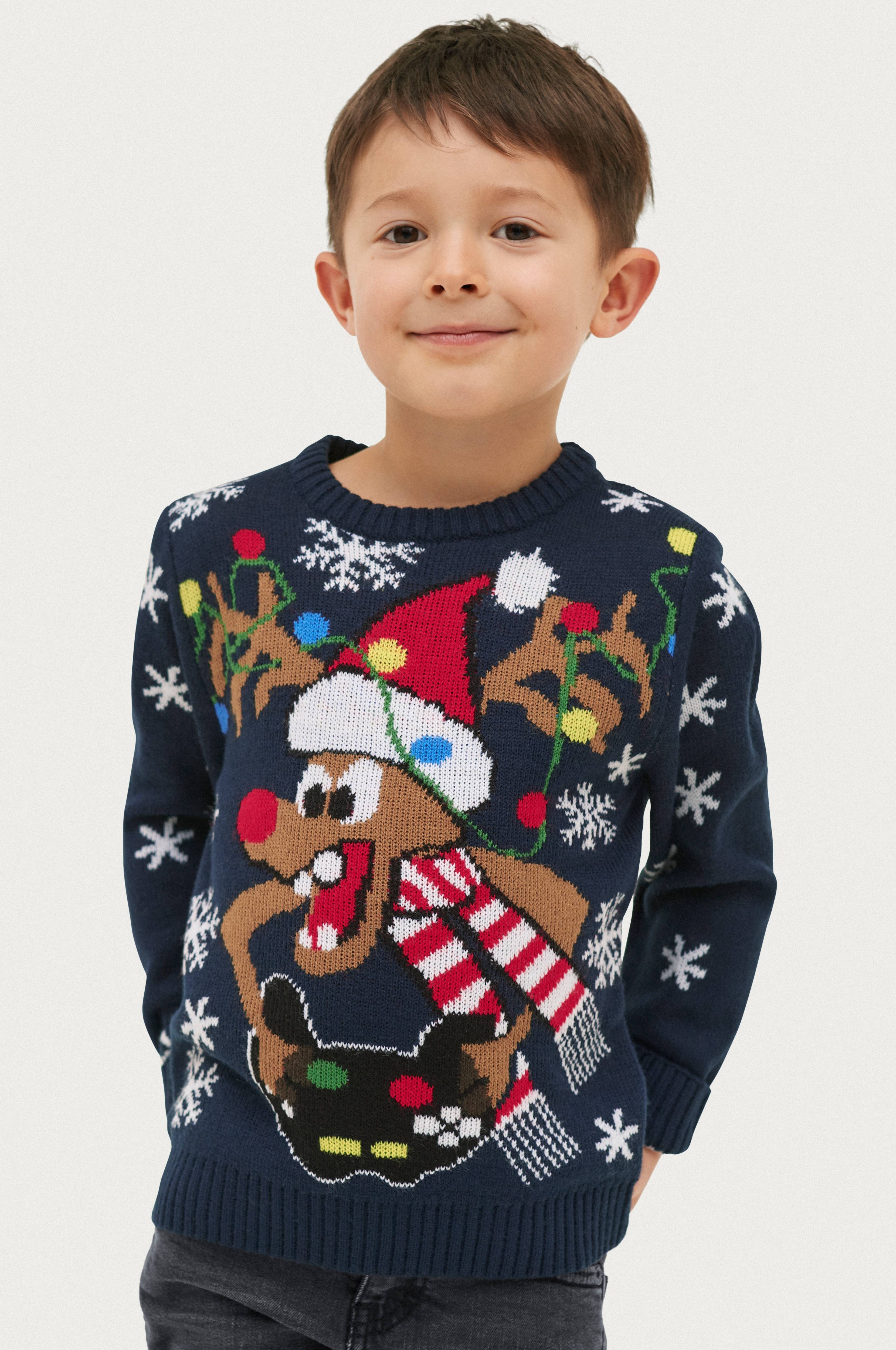 Juletrøje Christmas i blød, strikket kvalitet med julemotiv. Ribstrikket kant forneden, i ærmekant og hals.