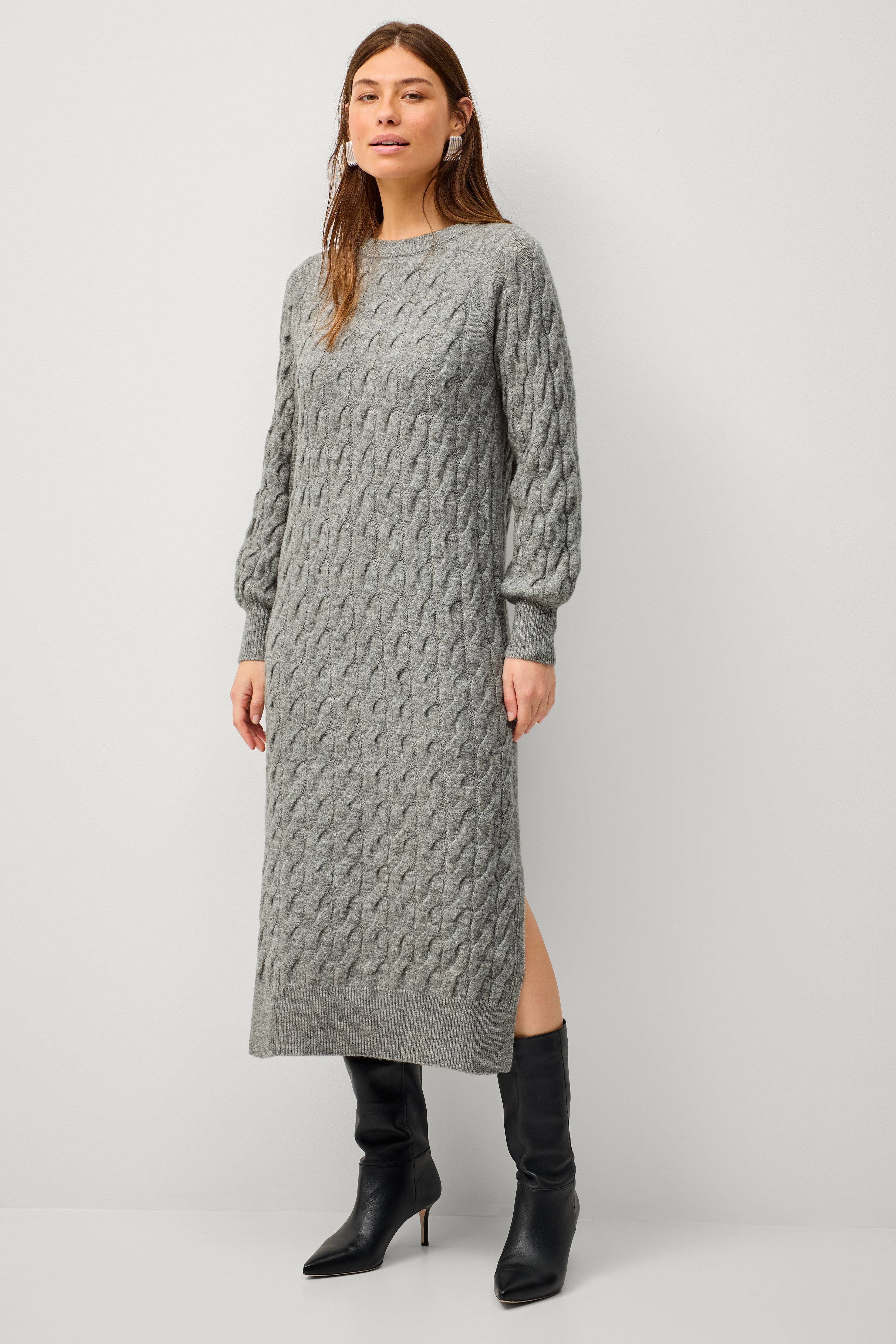 • Kabelstrikket kjole• Rund, ribbet halsudskæring• Ribstrikkede manchetter ved manchetterne• Slidser i siderne• Ribstrikket søm• Længde: 129 cm i størrelse S