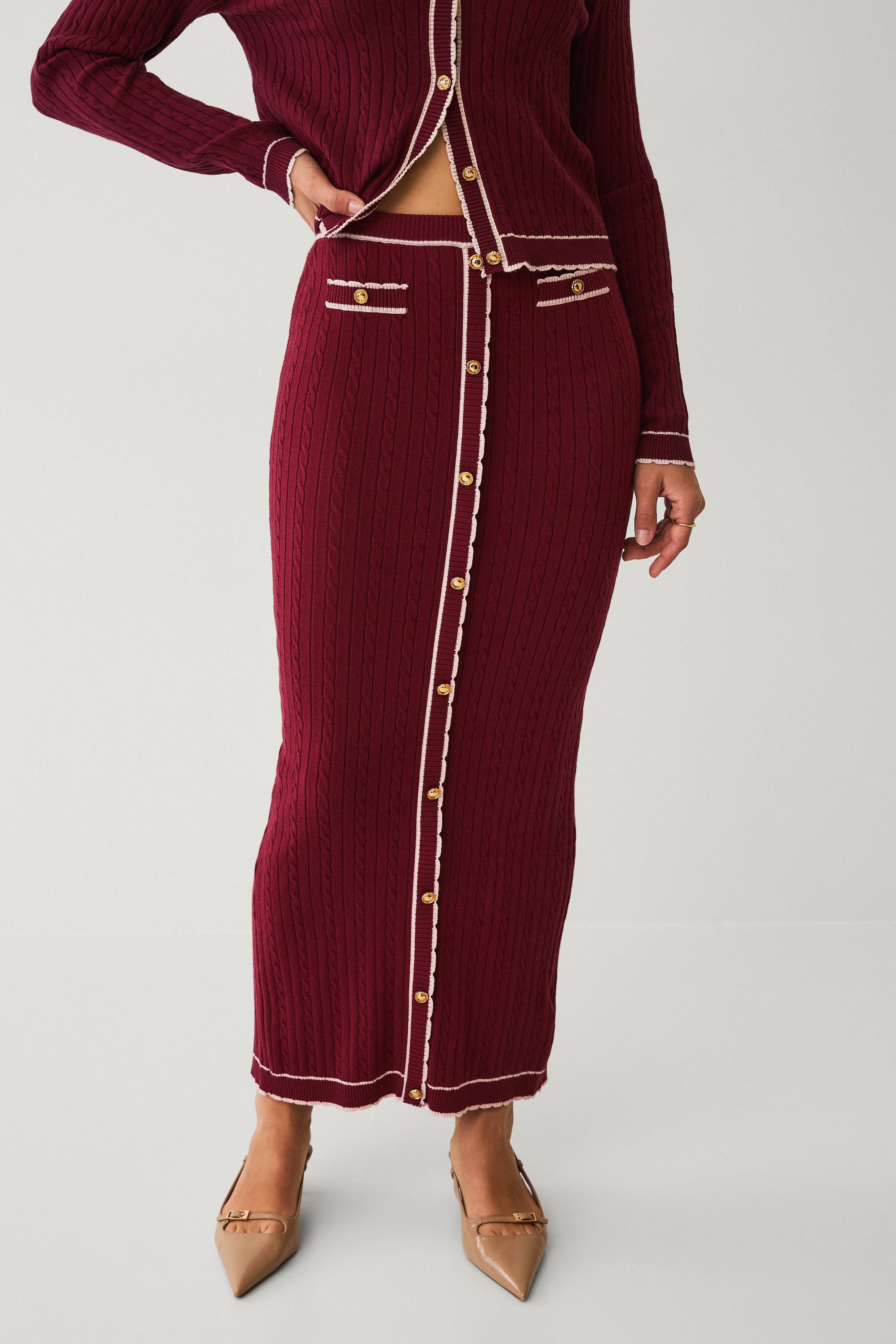 • Lang, kabelstrikket nederdel• Høj, elastisk talje• Dekorative knapdetaljer• To snydelommer foran• Bølgede, dekorative kanter• Slids nede bagved• Smal pasform• Længde: 101 cm i størrelse S