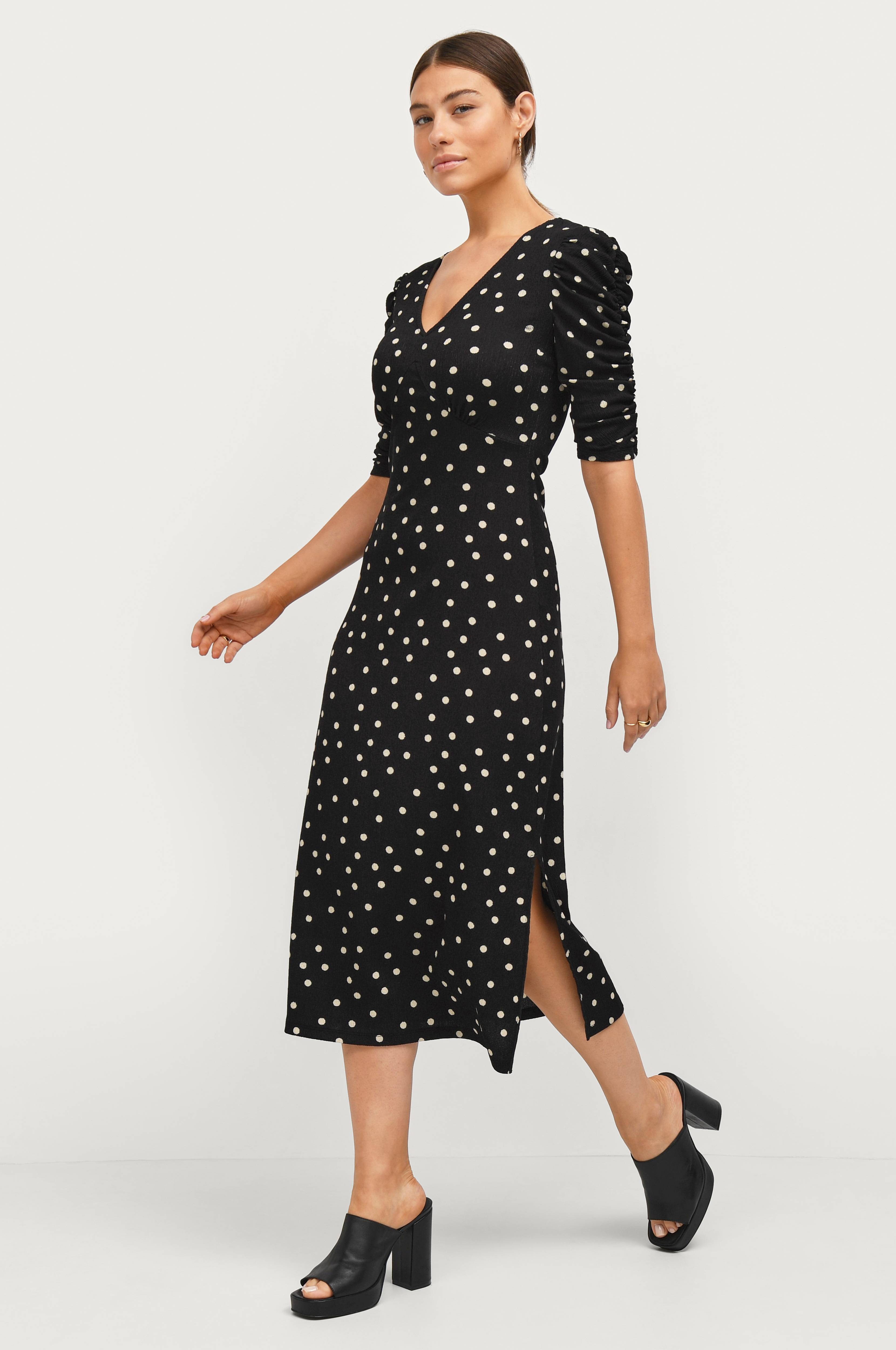 • Figurformede model i jersey med stræk • V-formet halsudskæring • Halvlangt ballonærme med elastisk drapering på oversiden • Længde: 122 cm i størrelse 34/36