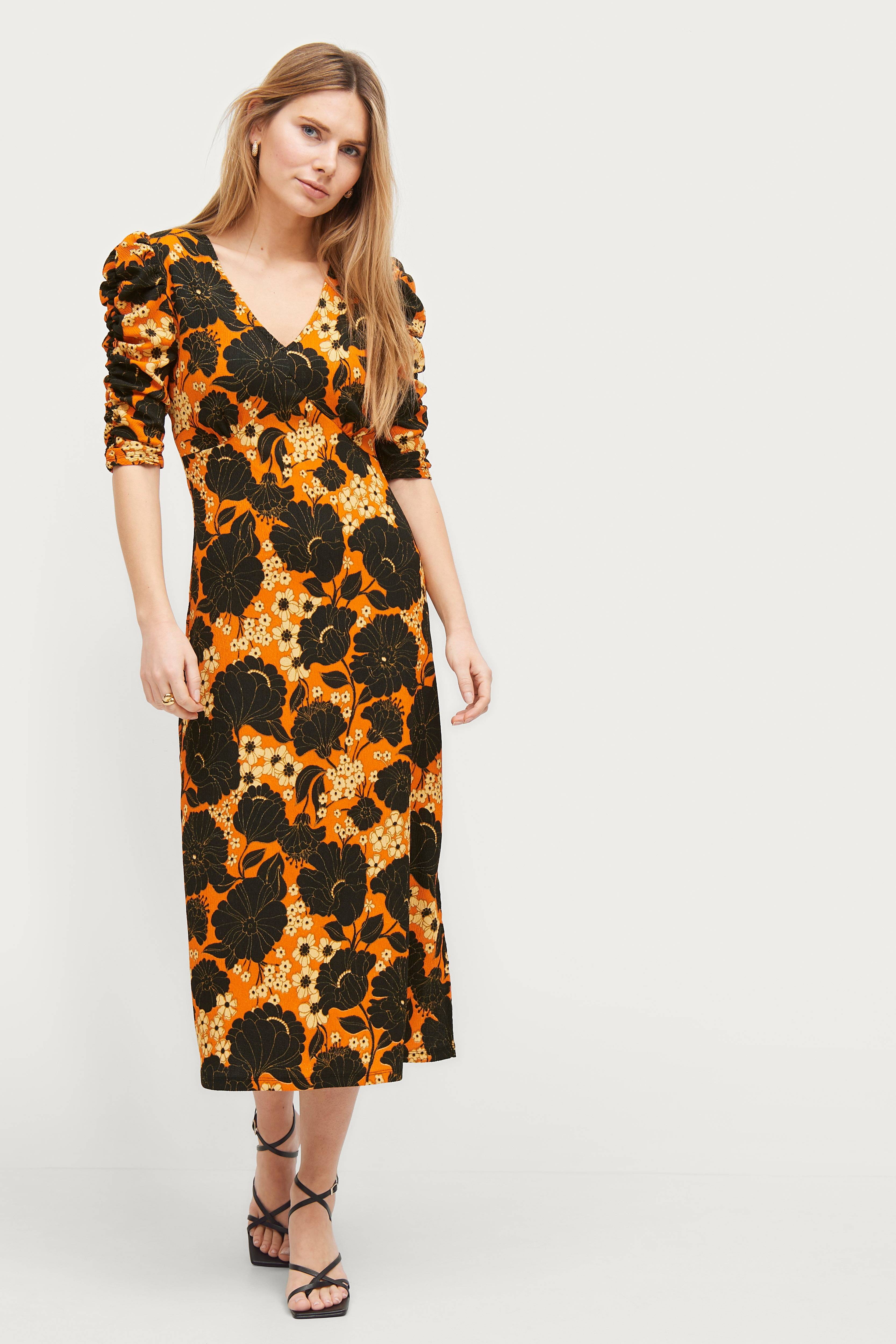 • Figurformede model i jersey med stræk • V-formet halsudskæring • Halvlangt ballonærme med elastisk drapering på oversiden • Længde: 122 cm i størrelse 34/36