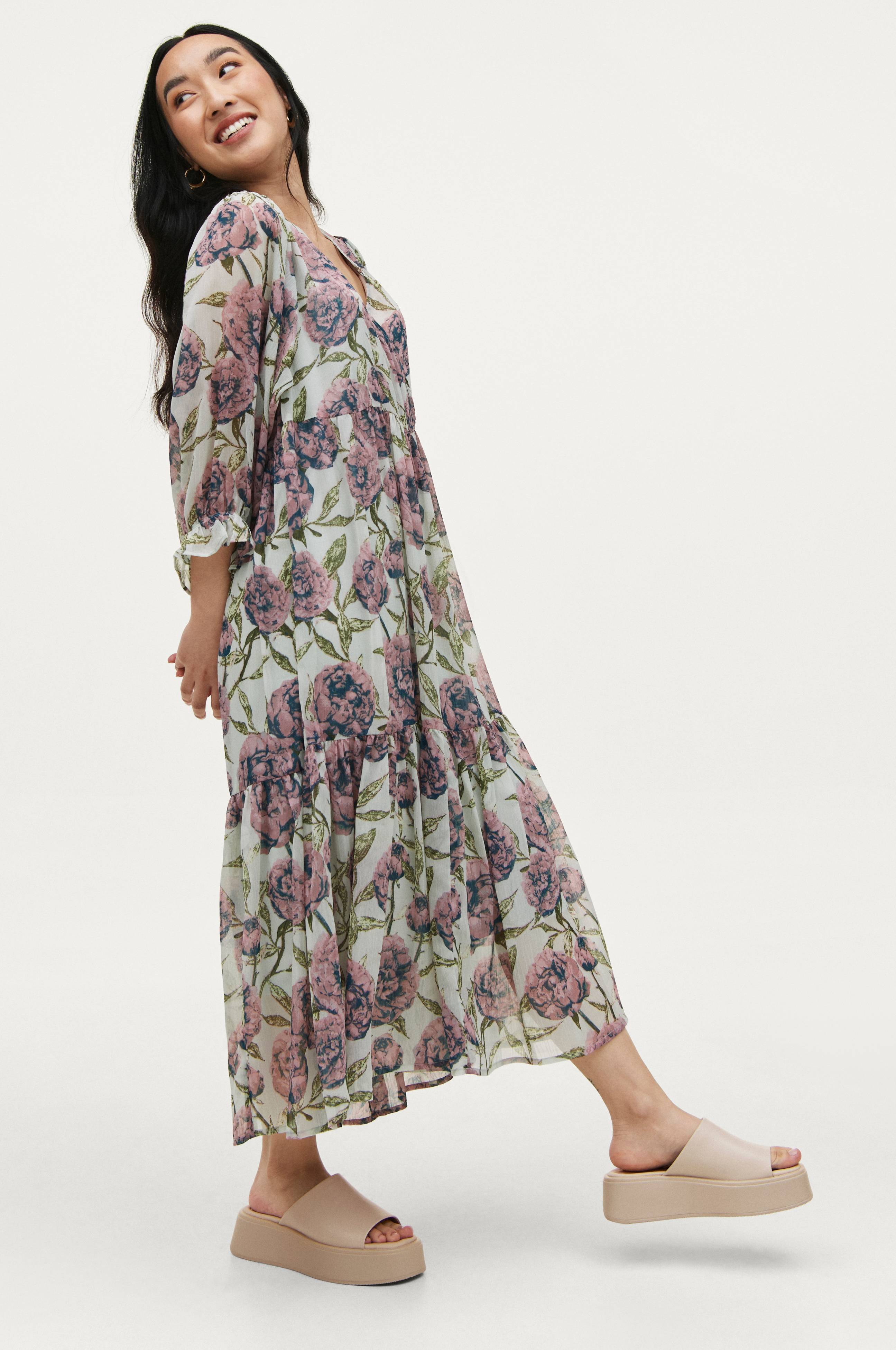 Kjole Annabelle i model med slå om-effekt i overdel foran. Afskæring med rynkning rundt om i taljen og påsyet flæse i kant forneden på nederdel. Vide, 3/4-lange ærme med rynkning ved skulderen og elastiksømme forneden. Chiffonkvalitet med udtagelig underkjole i jersey som har smalle, regulerbare skulderstropper, V-formet halsudskæring og ligeskåret ryg. Længde ca. 120 cm i str. 34/36.