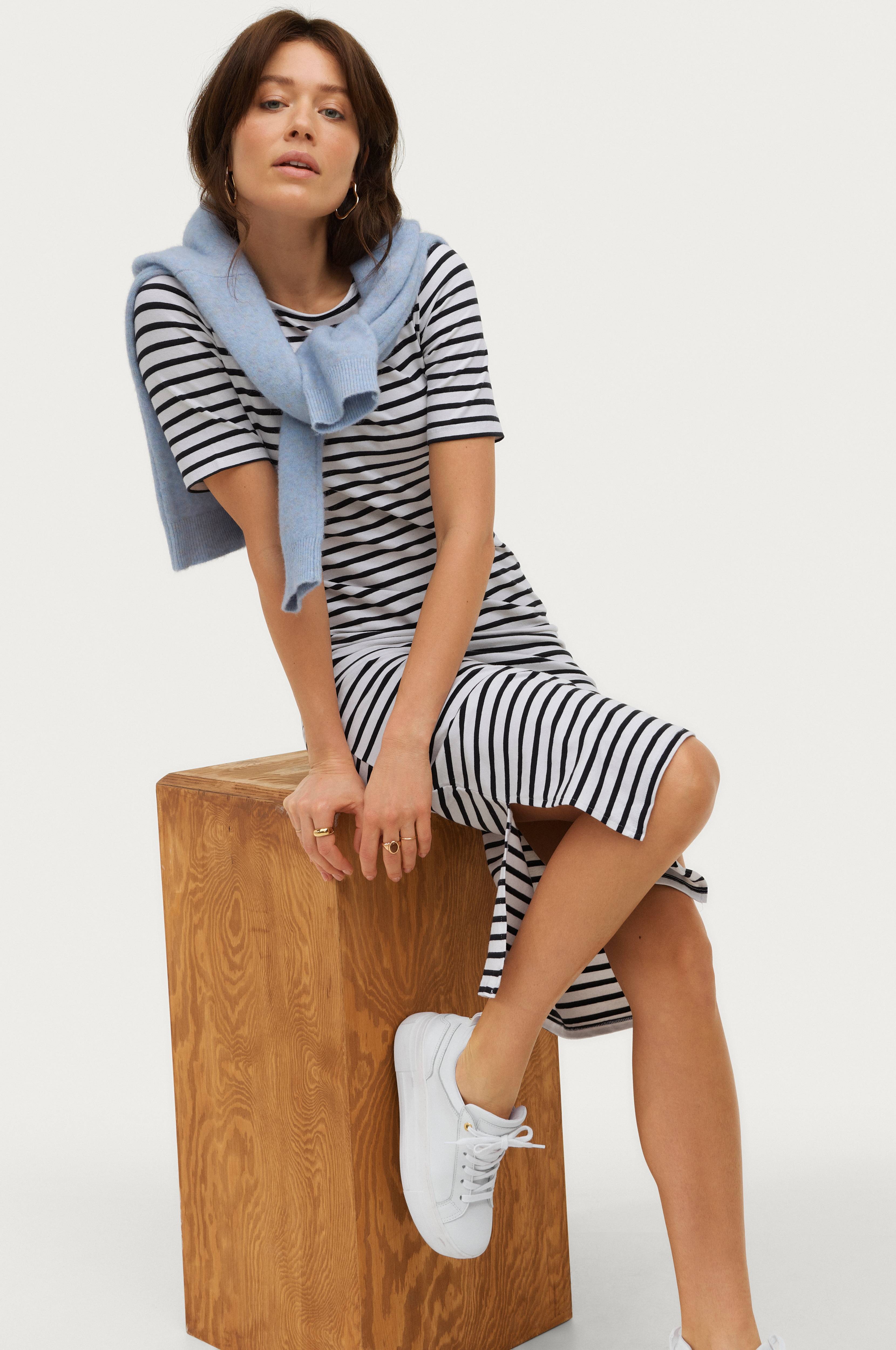 Havde dette i sort allerede og nu købt stribet. Sidder godt, bare stramt med en lille let bådring og flot med slids i siden. Det er virkelig lykkeligt!