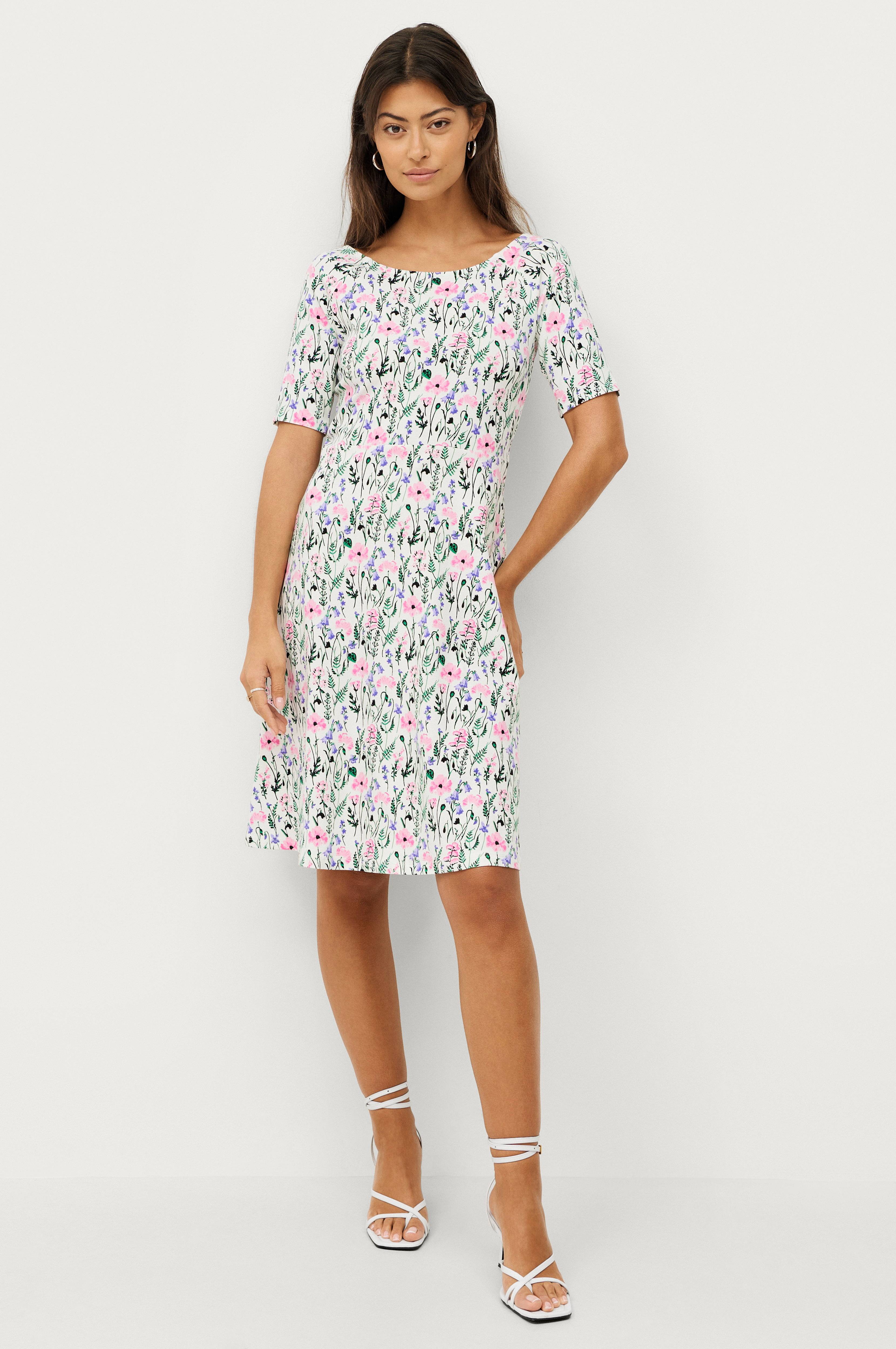 Kjole Boel i stretchjersey af fin bomuld. Faconsyet model med afskæring rundt om i taljen og vidde i nederdel. Flot, vid halsudskæring med smal søm og kort raglanærme. Længde ca. 96 cm i str. 36.