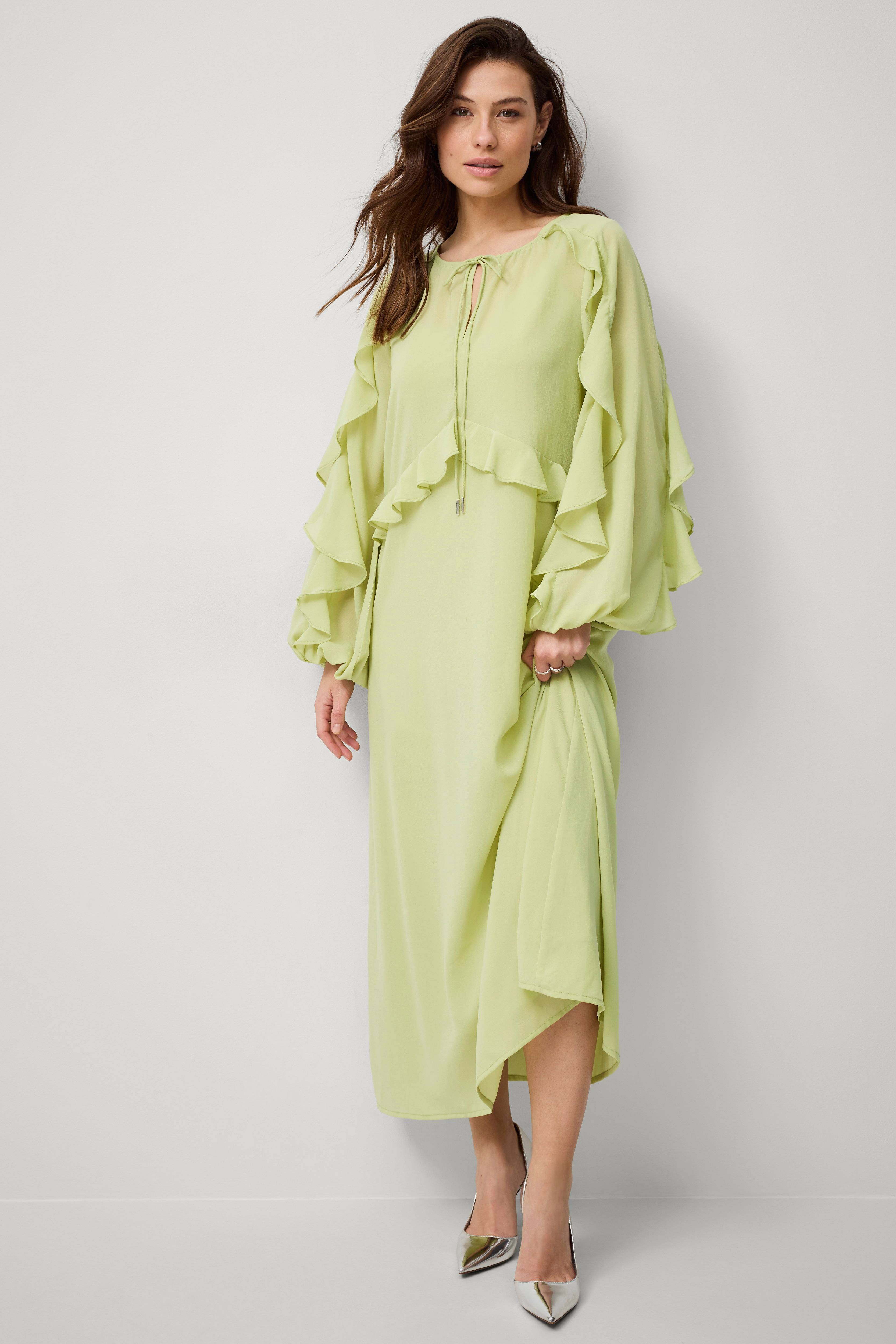 • Lang kjole i chiffon • Ventilation med bindebånd i halsen • Ballonærmer med volant • Volant ved taljen • Underkjole i jersey • Længde: 128 cm i størrelse 34/36