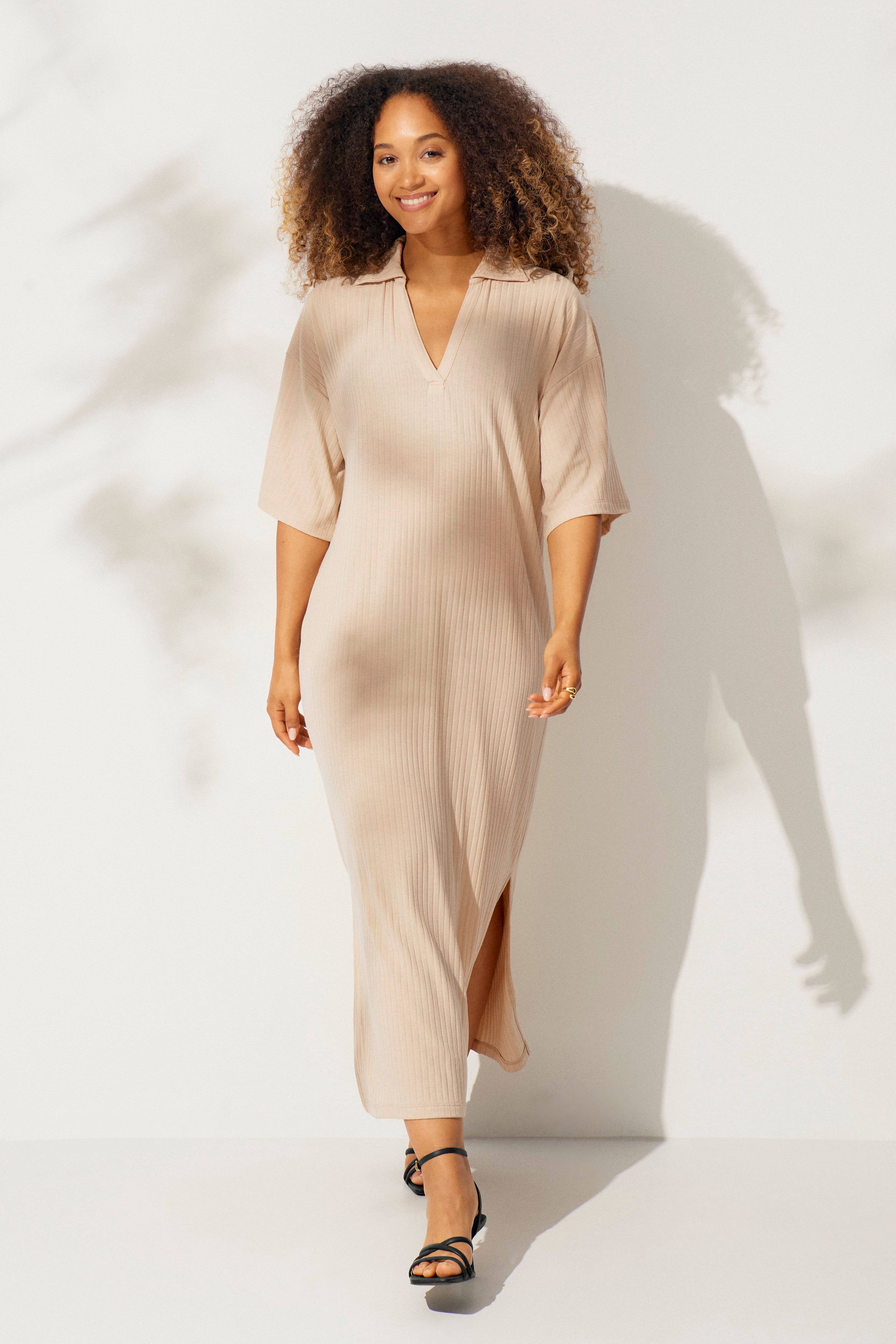 • V-udskæring med krave• Korte, brede ærmer• Nedsænkede skuldre• Slidser nede i siderne• Fremstillet af ribbet jersey• Længde: 129 cm i størrelse 34/36