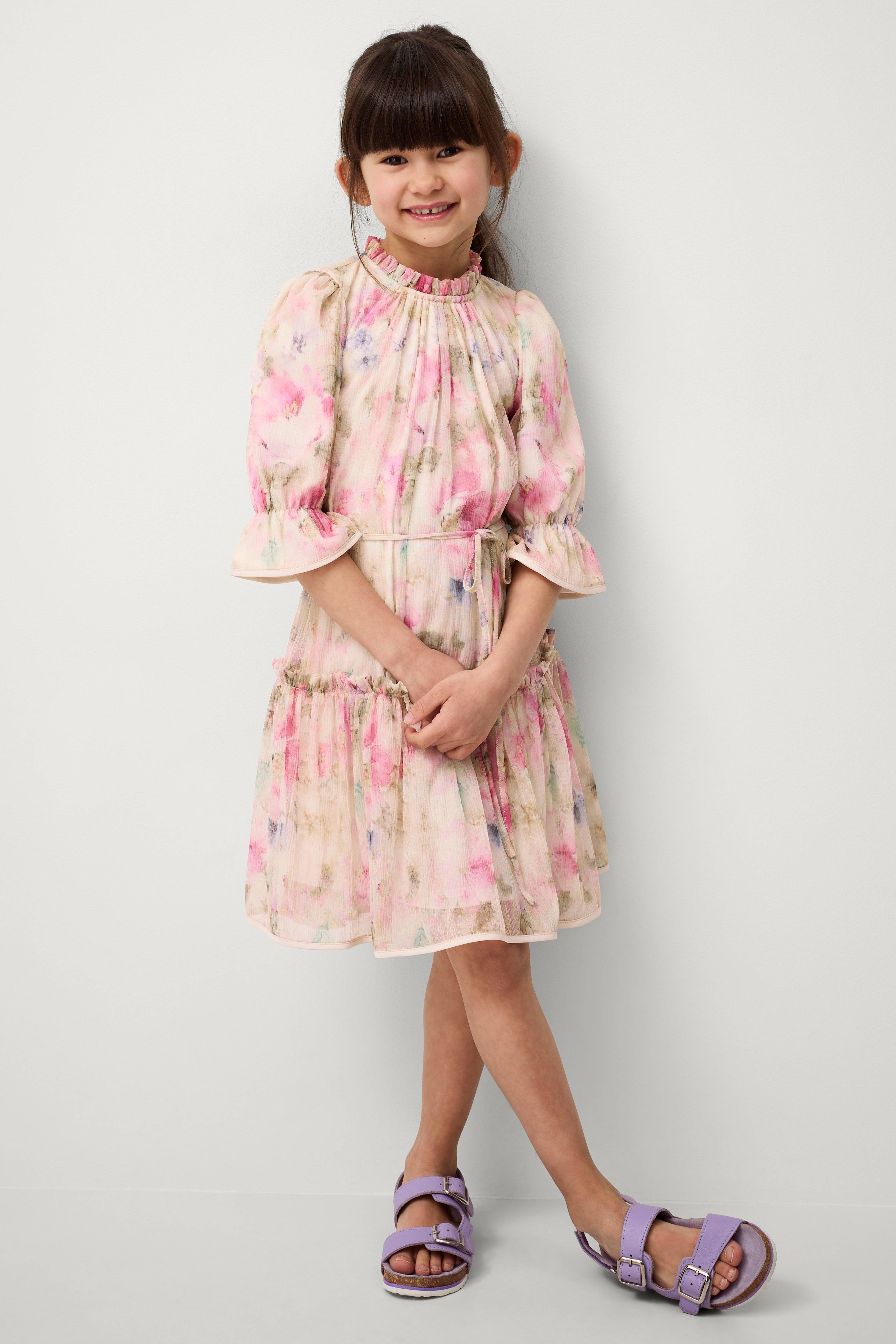 • Kjole i rynket chiffon• Volant i halsen• Ventilation med knap i nakken• Ballonærmer• Trikotfor