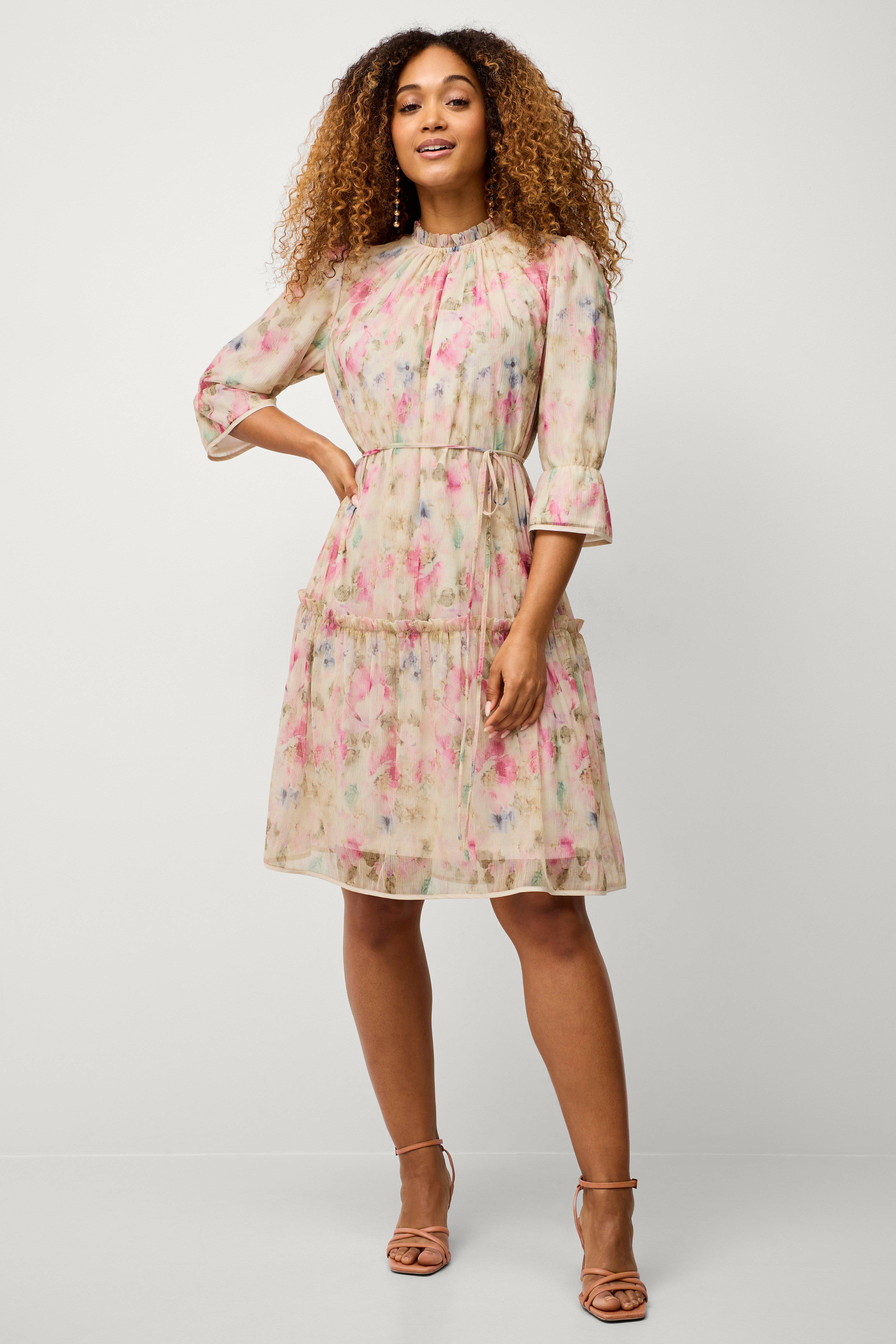 • Kjole i rynket meshtrikot • Volant i halsen og nederst • 3/4 lange ballonærmer med volant ved manchetterne • Ventilation med knap i nakken • Bindebånd ved taljen • Trikotfor • Længde: 100 cm i størrelse 34/36
