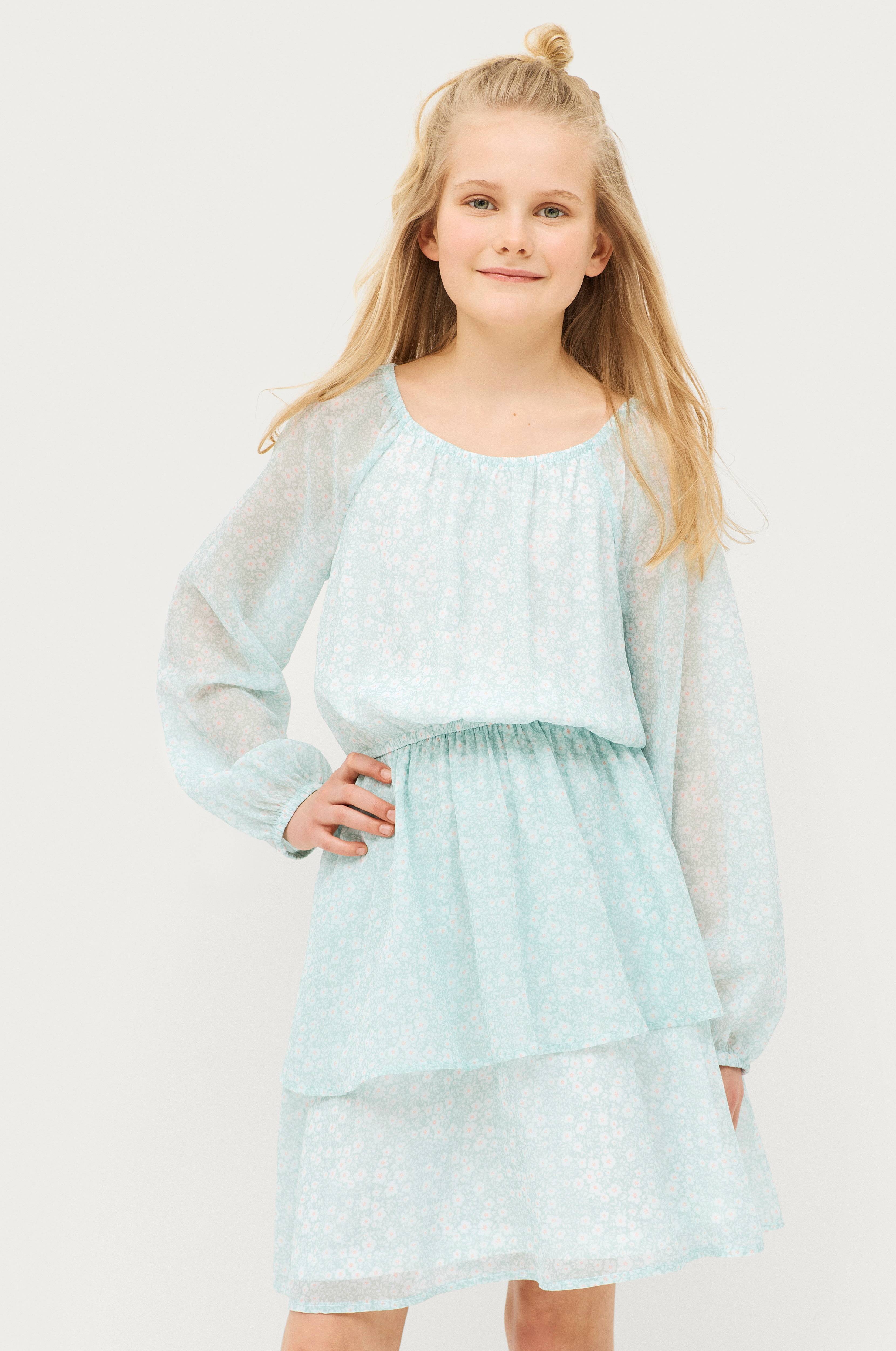 - Flæsekjole - Elastisk halsudskæring - Transparentae ballonærmer med elastiske ærmekanter - Elastisk talje - Flæser - Lavet af chiffon - Jerseyfor - Produktet indeholder genindvundet materiale, som genbruges for at reducere mængden af affald samtidigt med at der ikke anvendes nye ressourcer.