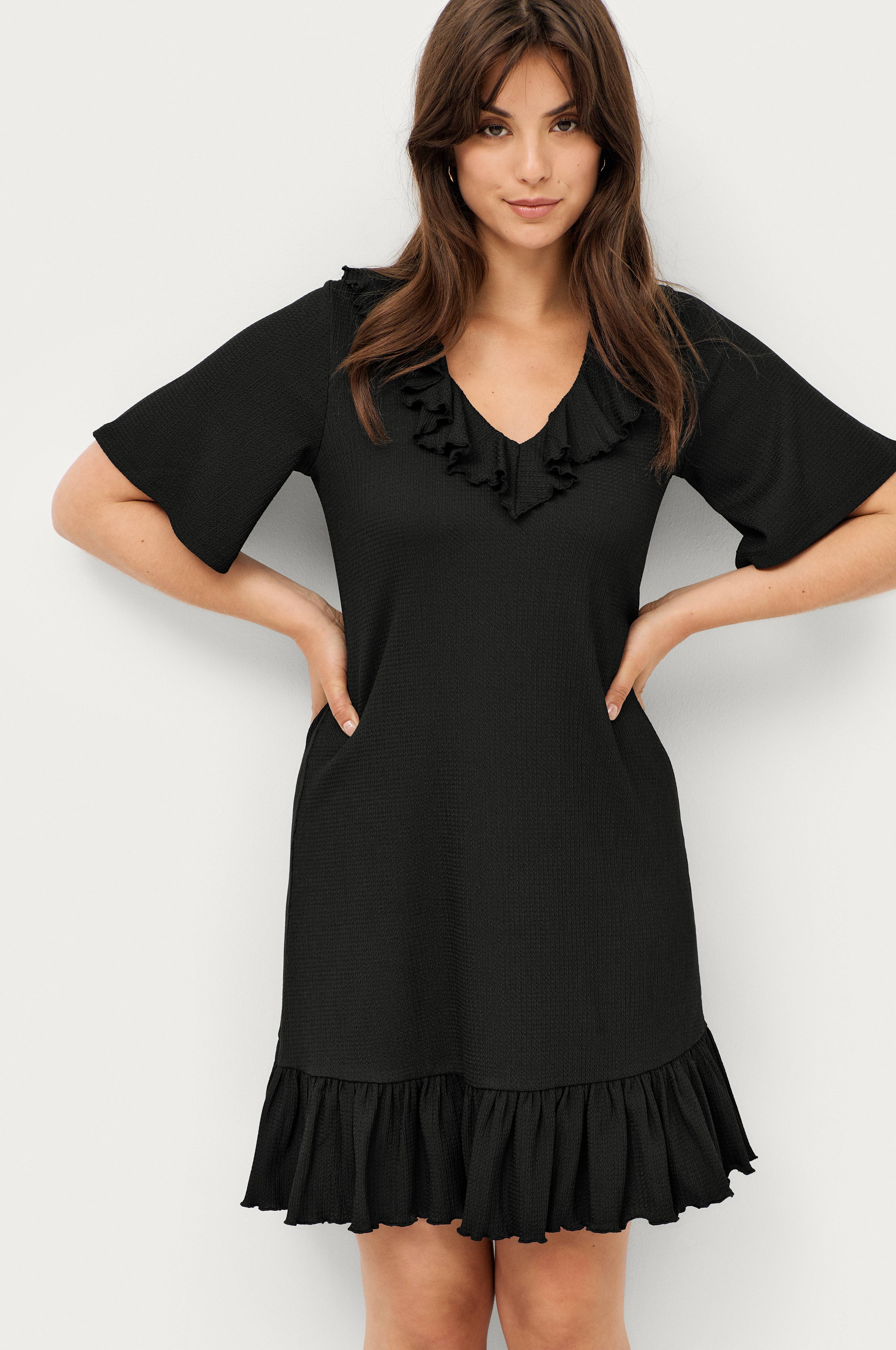 • Let udsvingende model• V-udskæring med volant• Korte ærmer• Volant nederst• Kreppet strækkvalitet• Længde: 96 cm i størrelse 34/36