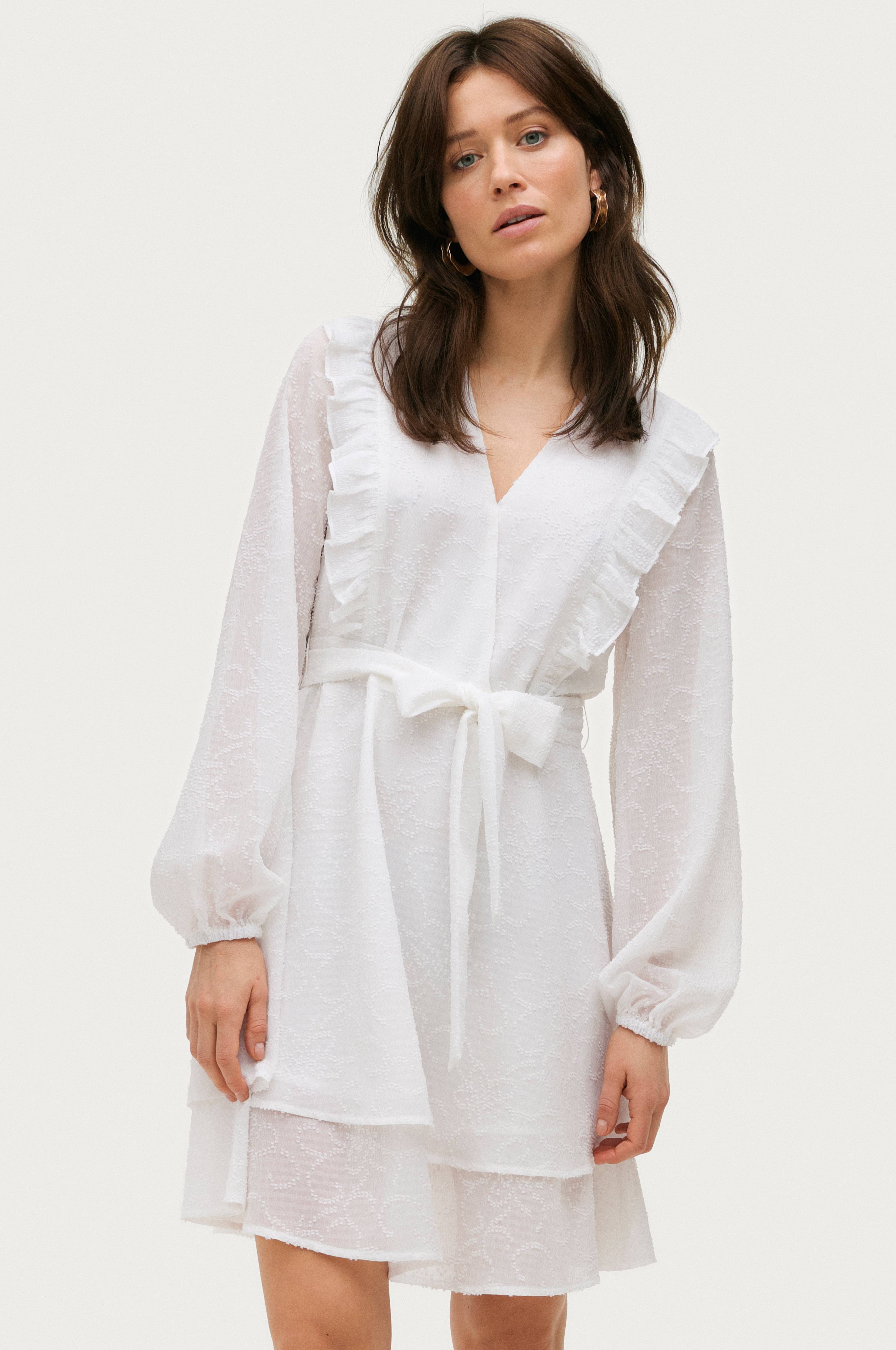 • V-udskæring med slå-om design• Volanter oppe foran• Lange ballonærmer• Bæltespænde ved taljen• Skjult lynlås i siden• Volantnederdel• Fremstillet af chiffon med strukturmønster• Foret• Længde: 94 cm i størrelse 36