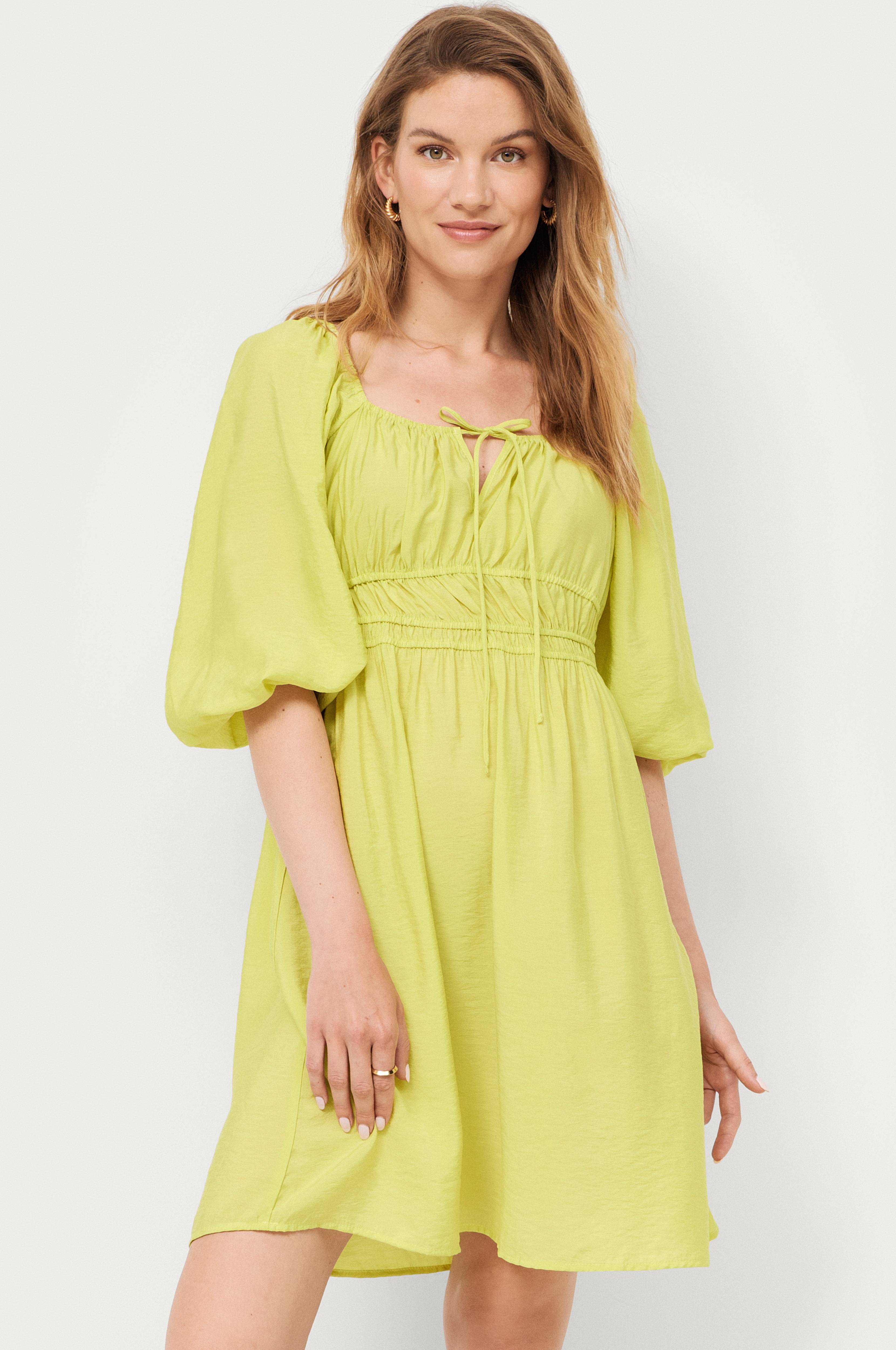 • Bred, elastisk halsudskæring med ventilation og bindebånd foran • 3/4 lange ballonærmer med elastiske manchetter • Elastisk talje med samling • Længde: 90 cm i størrelse 34/36