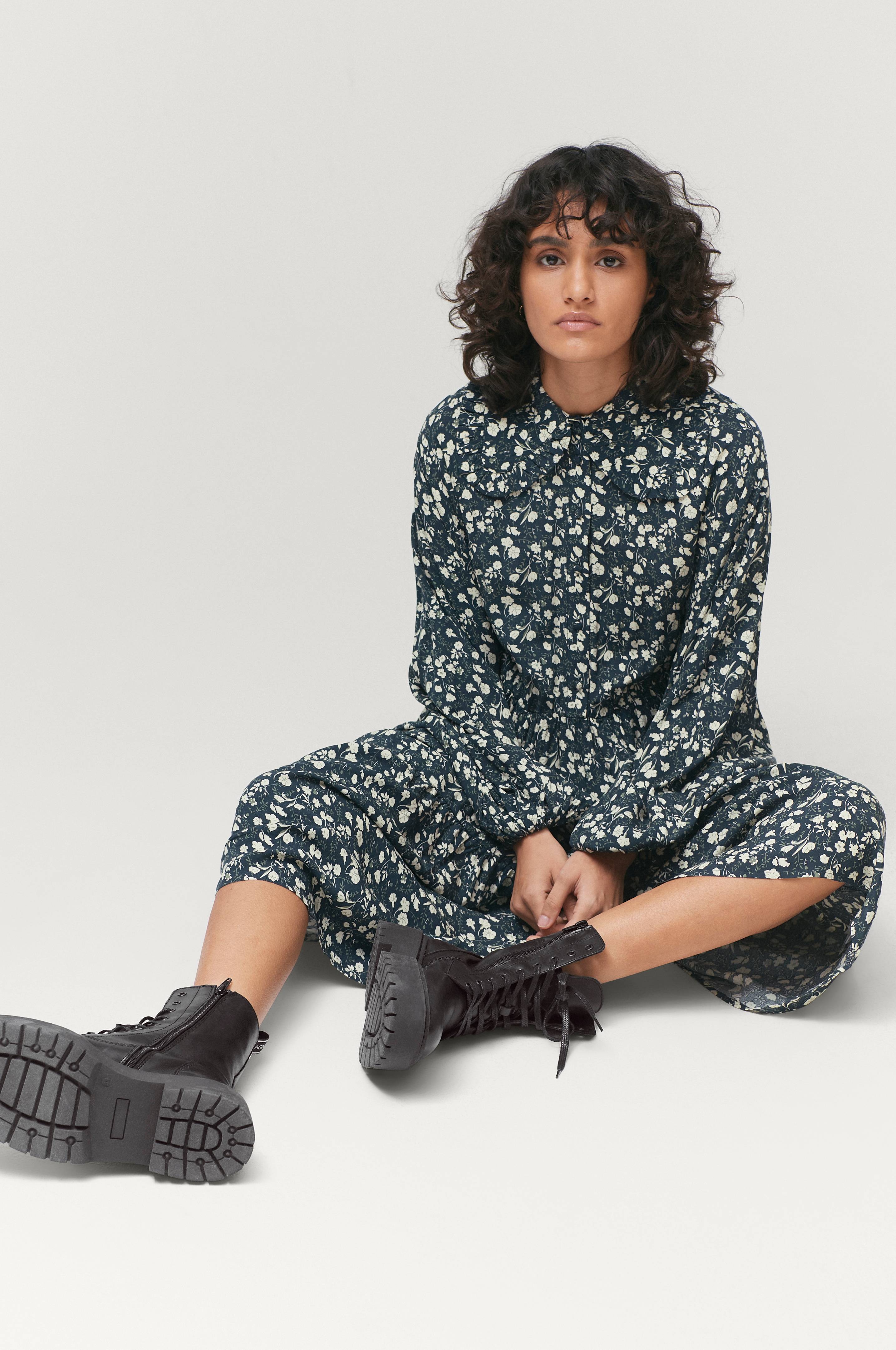 Kjole Frida i blød, vævet viskose med småblomstret mønster. Læglang model med betrukne knapper foran og stor krave med flæsekant. Elastisk talje og A-formet nederdel med flæse. Lange ballonærmer med elastisk ærmekant. Længde ca. 120 cm i str. 34/36.