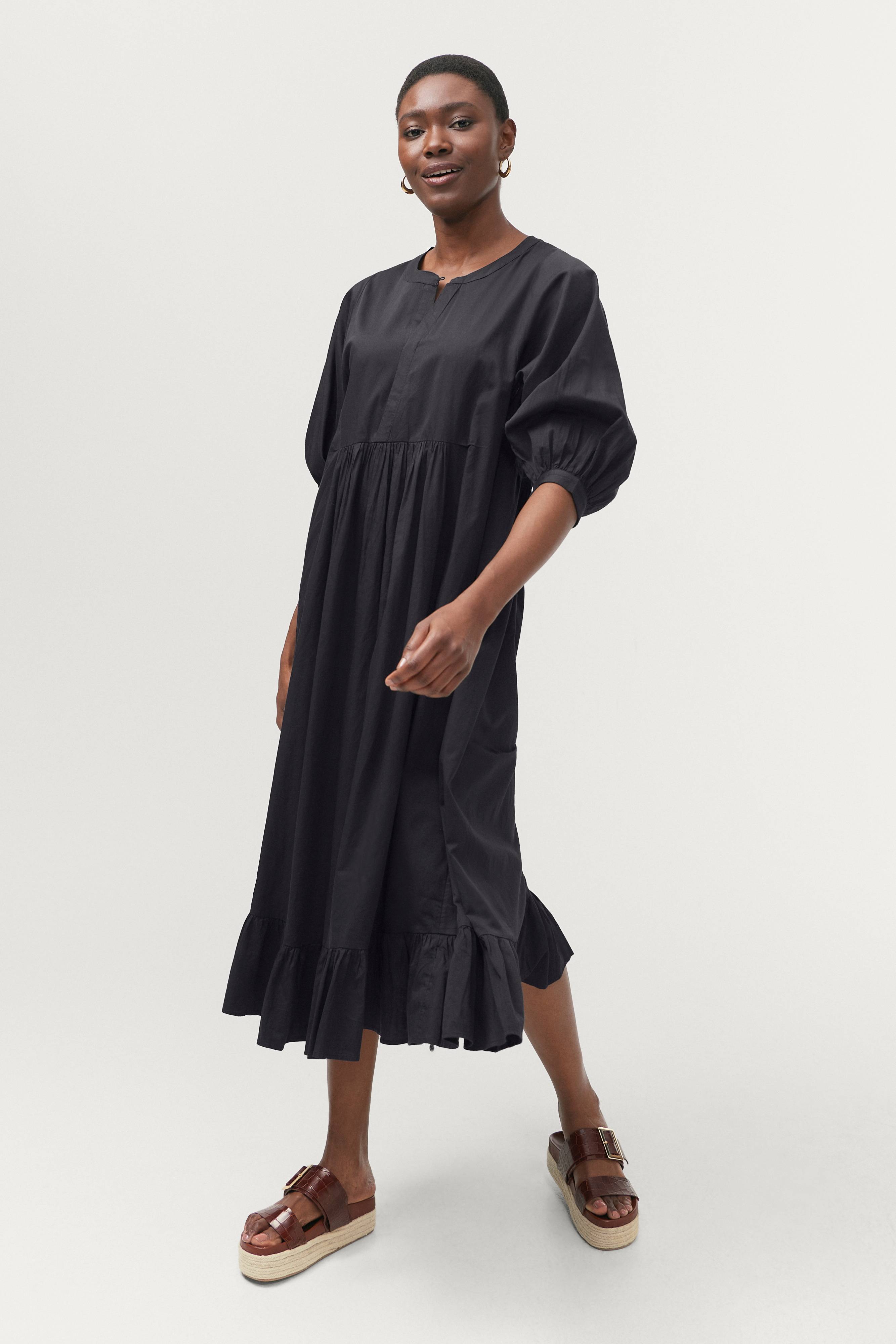A-formet oversizemodel med slå om-snit på brystet som har skjult trykknap og skjult knap i hals. Ekstra vidt ærme i 3/4-længde med påsyet kant i ærmekant. Afskæring med rynkning bagpå og midt foran i taljen samt påsyet flæse i kanten forneden. Længde ca. 126 cm i str. 34/36.