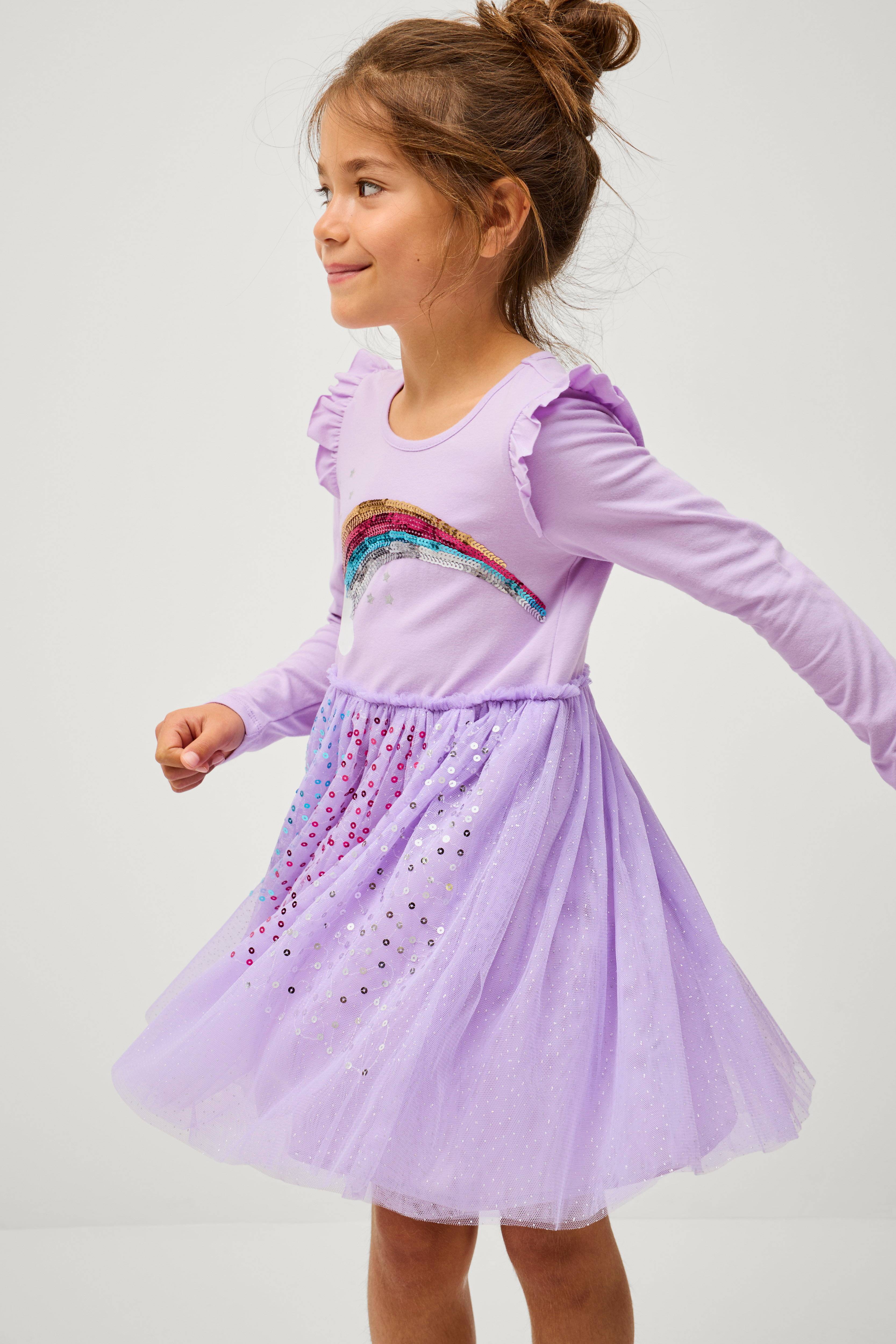 • Langærmet øvre del i blød, elastisk jersey• Rund halsudskæring• Pailleter foran med tryk• Nederdel i tyl med pailletter foran• Vævet for