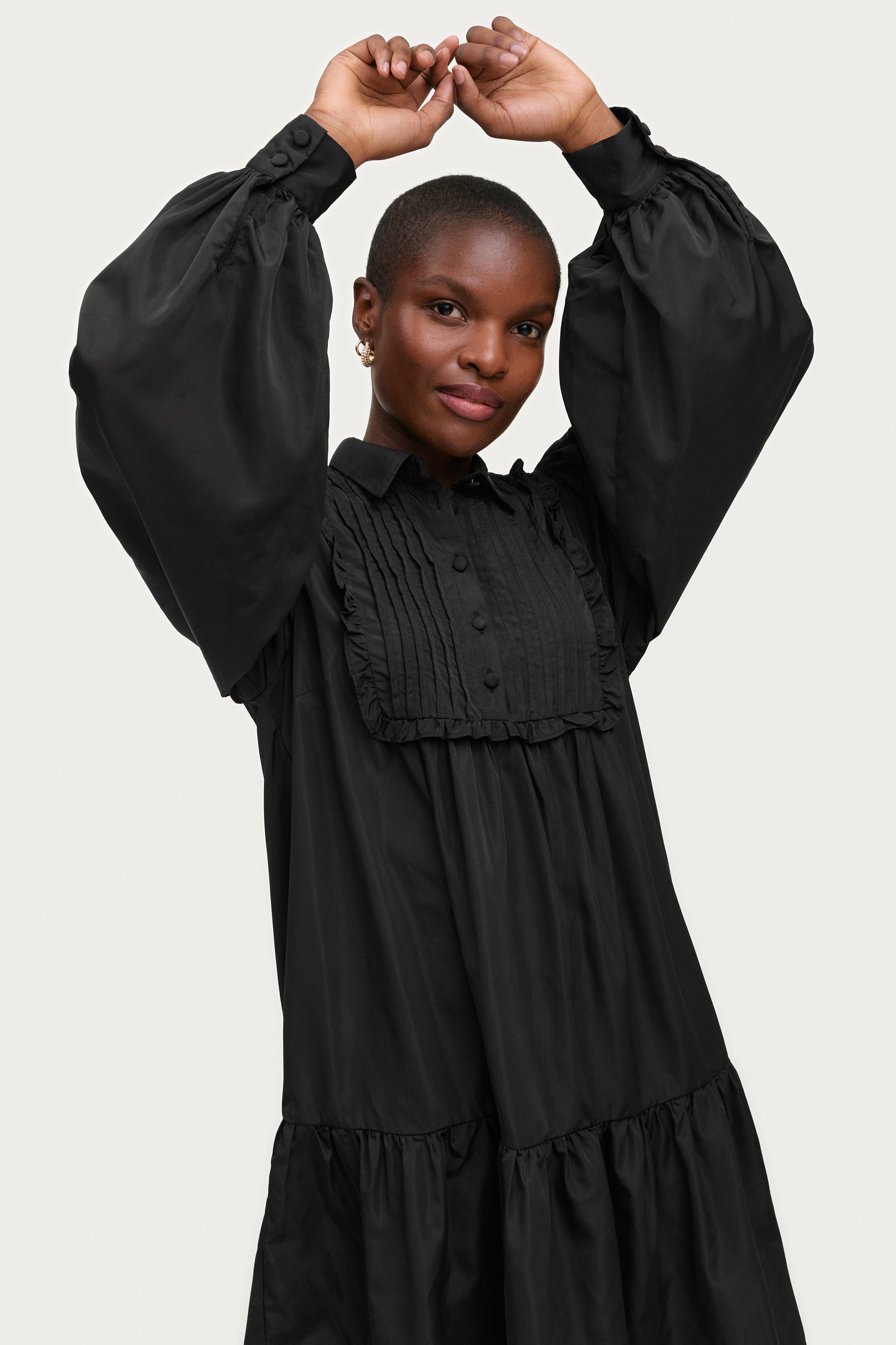 • Kort model med volant nederst• Knapper oppe foran• Voluminøse ballonærmer med manchet• Syede lægge oppe foran• Volant foran• Kvalitet med glans• Længde: 88 cm i størrelse 36