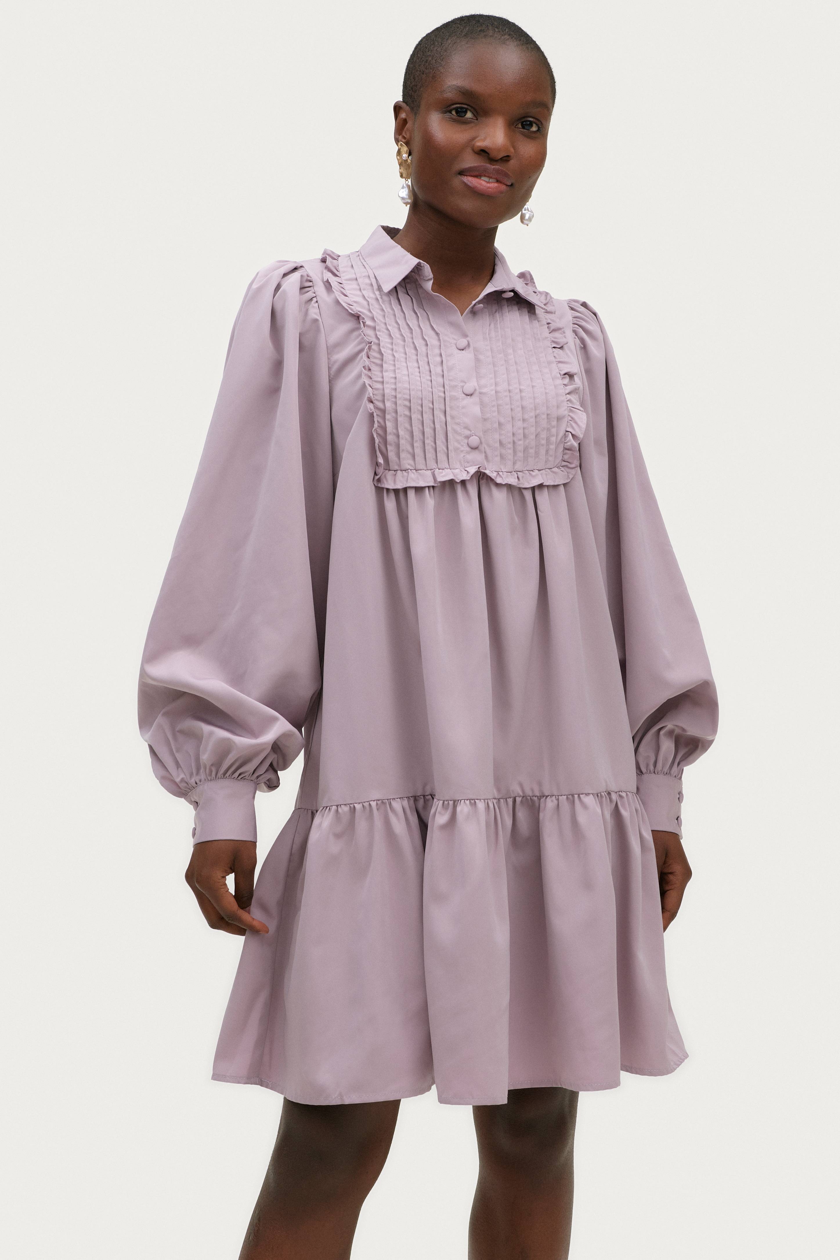 • Kort model med volant nederst• Knapper oppe foran• Voluminøse ballonærmer med manchet• Syede lægge oppe foran• Volant foran• Kvalitet med glans• Længde: 88 cm i størrelse 36