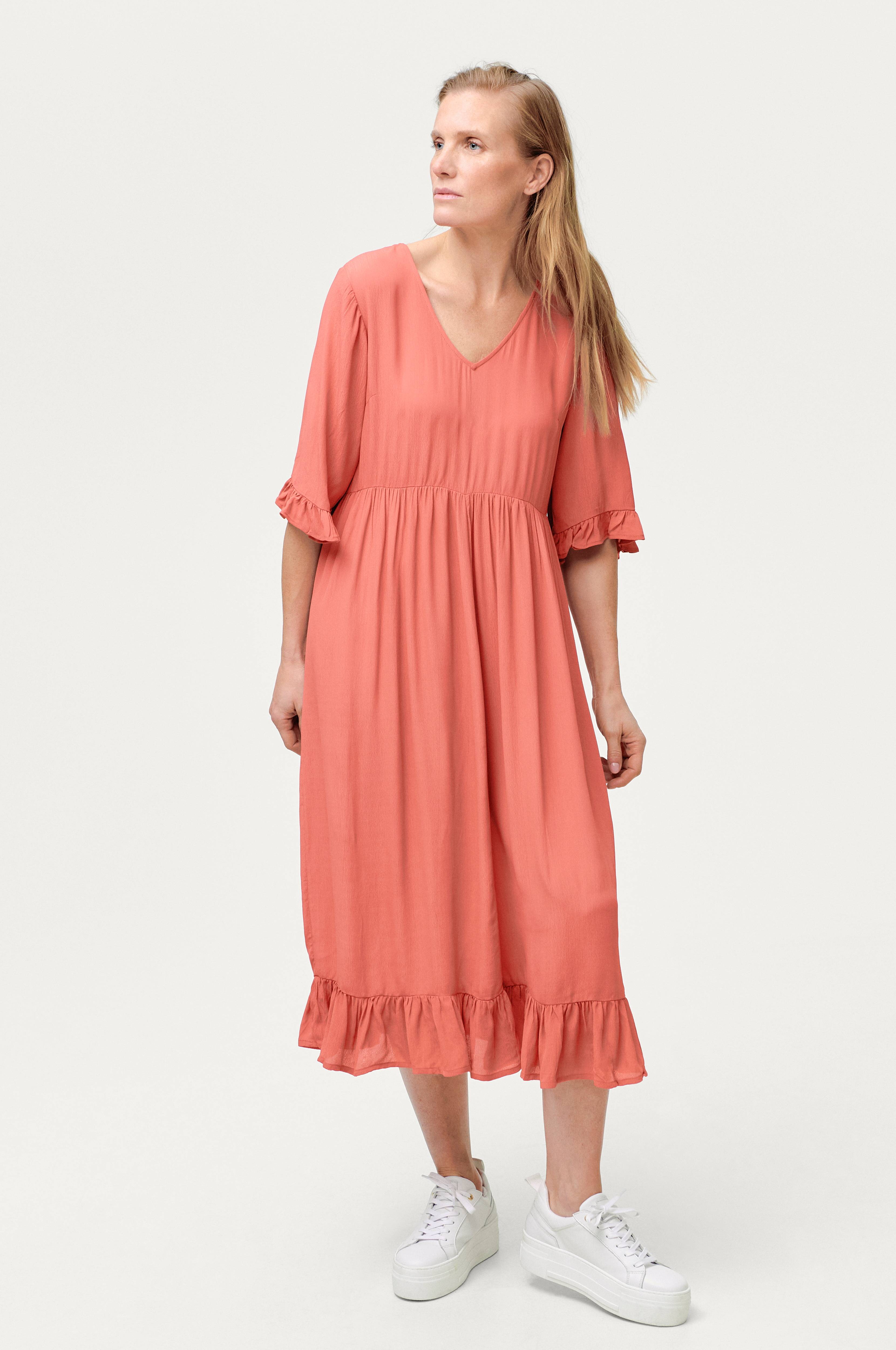 Kjole Isabel i læglang model med romantiske indslag som flæser og en løs, bølgende silhuet. V-udskæring foran og rynket talje. Halvlange ærmer med flæse. I vævet kvalitet. Længde ca. 124 cm i str. 36.